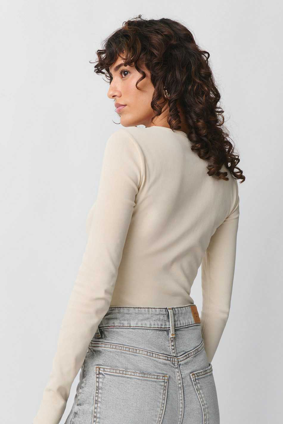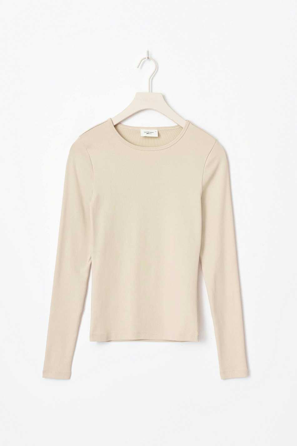 Long sleeve top with ribbed quality. The top is beige and has figure-hugging fit. It has round neckline and regular length.