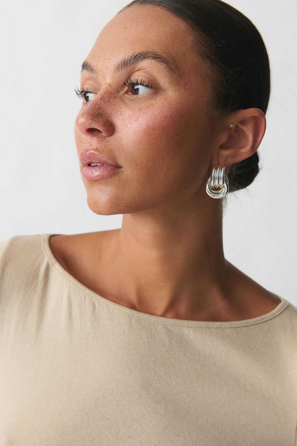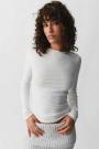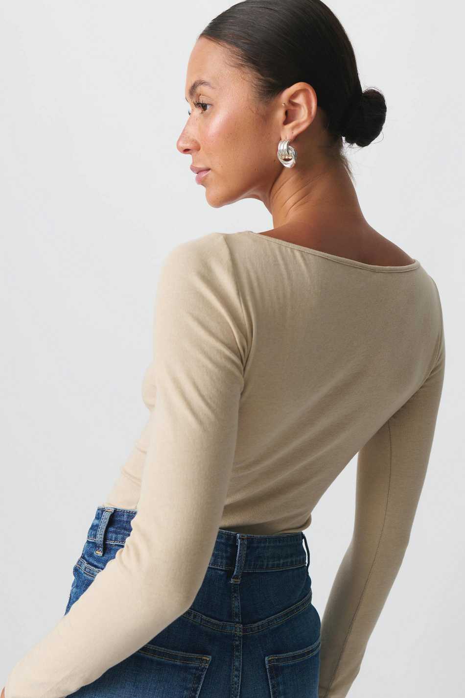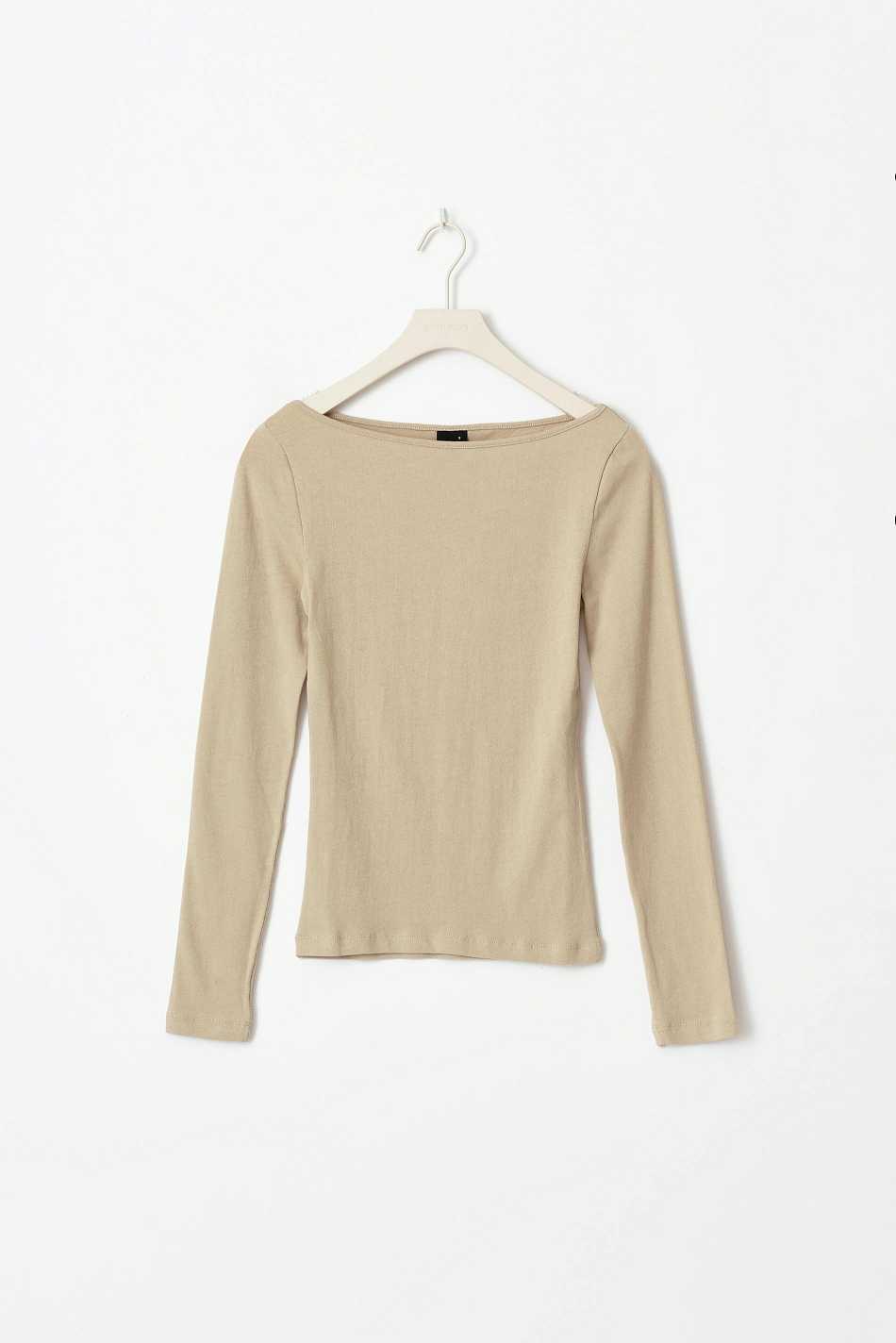 Long-sleeved top with boat neckline. The top is beige and has figure-hugging fit.