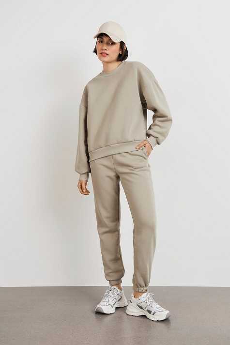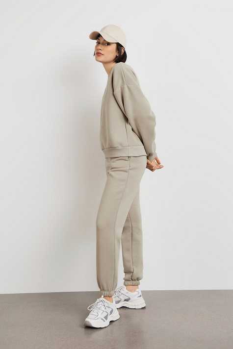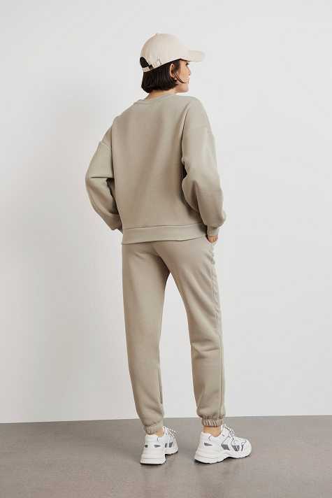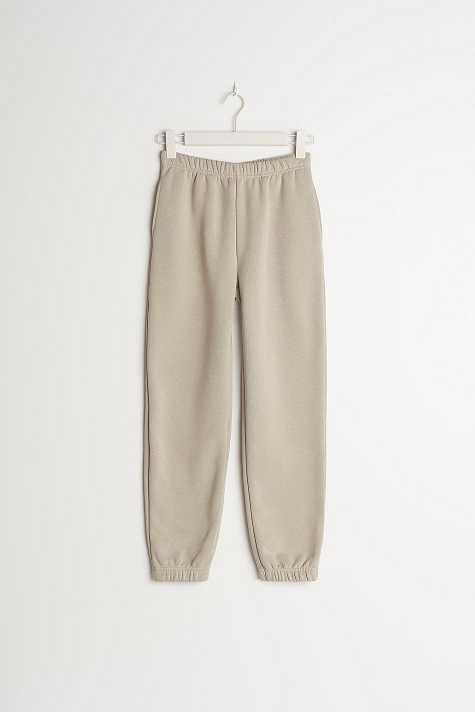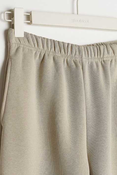 Tracksuit trousers with a regular fit. The trousers are beige and have pockets on the sides. They have an elastic band at the waist and at the end of the legs.
