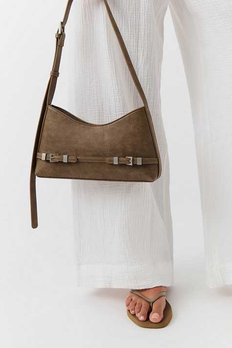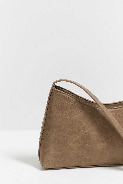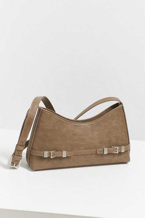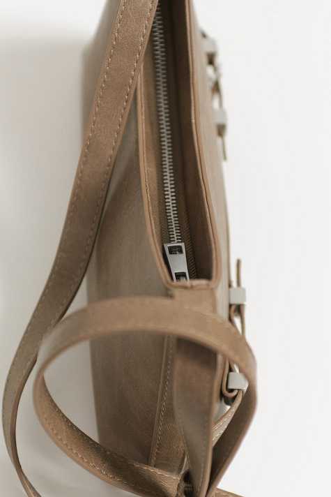 Bag in imitation leather with long, adjustable shoulder strap. The bag is brown and has zip closure. It has belted detail at the front with silver coloured buckles.