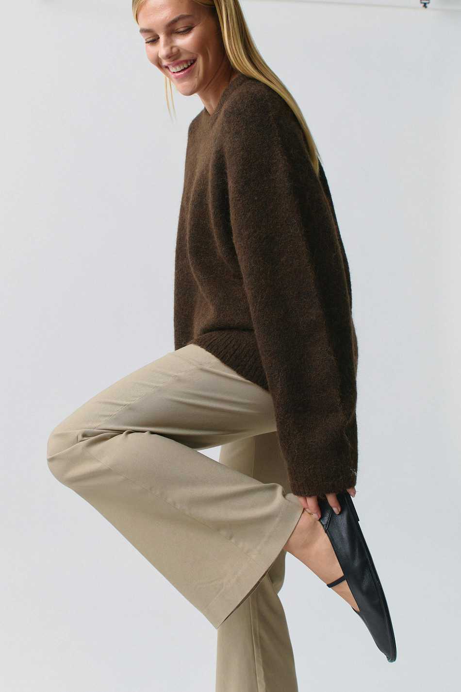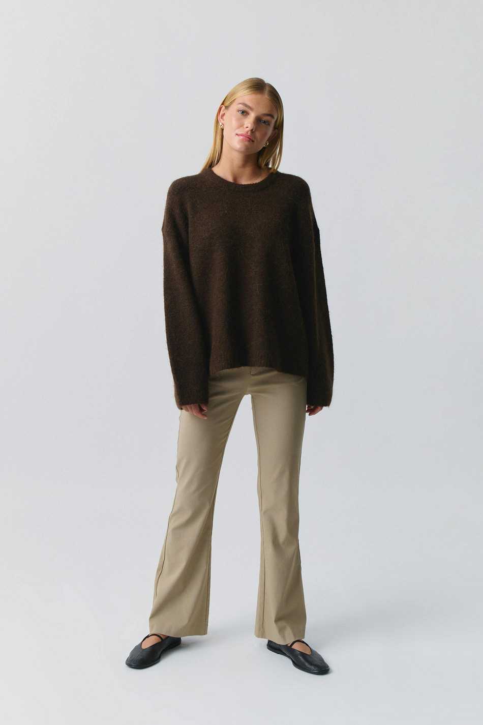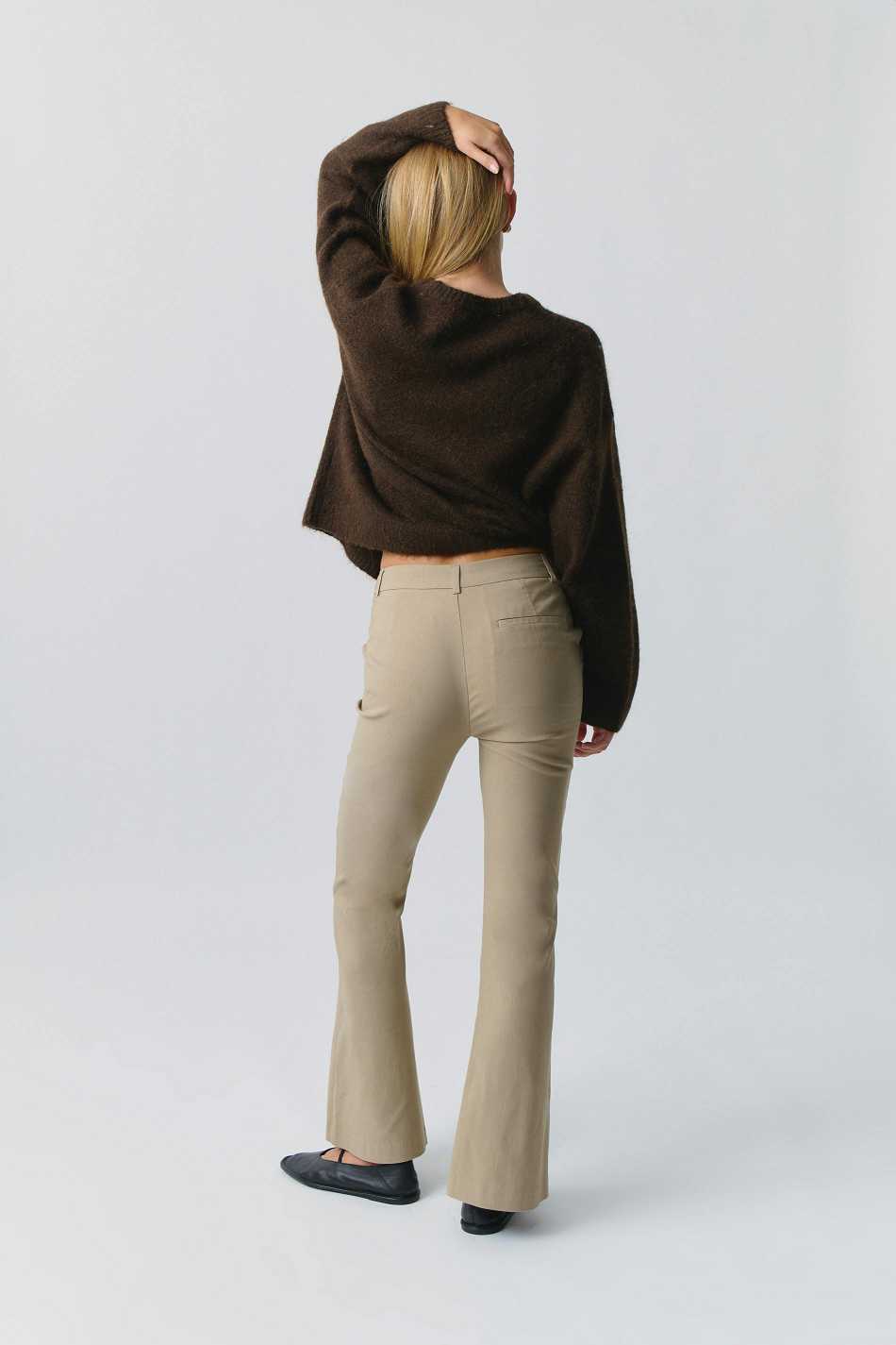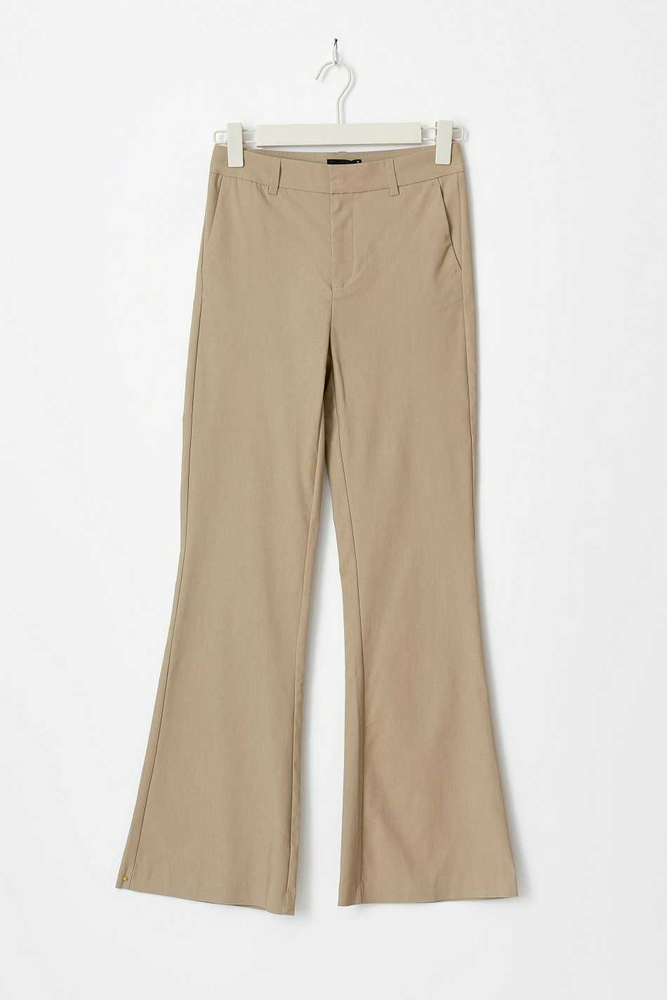 Flared suit trousers with mid waist. The trousers are beige and have stretchy quality. They have side pockets, broad waistband with belt loops, zip fly and hook-and-eye closure.