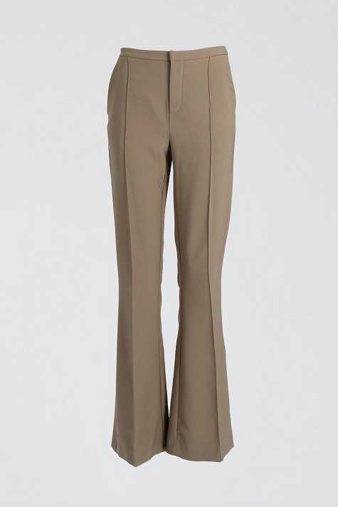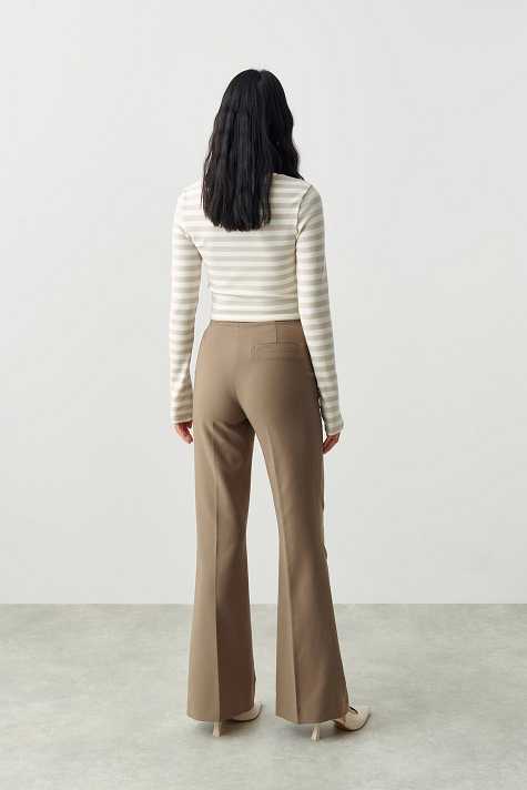 Dress trousers with a stretch and mid waist. The trousers are beige and have slim fit. They have flared legs, side pockets, fake pockets at the back and zip fly.