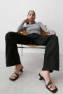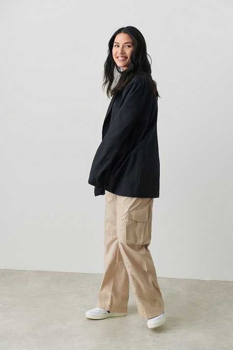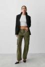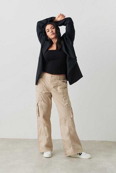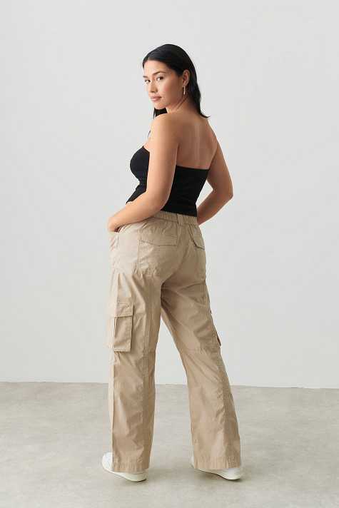 Cargo pants with mid waist. The trousers are beige and have cargo pockets in the sides. They have elastic at the waist, slightly flared legs, flap pockets at the back, zip fly and belt loops.