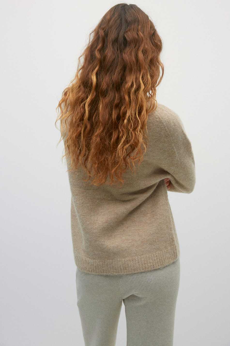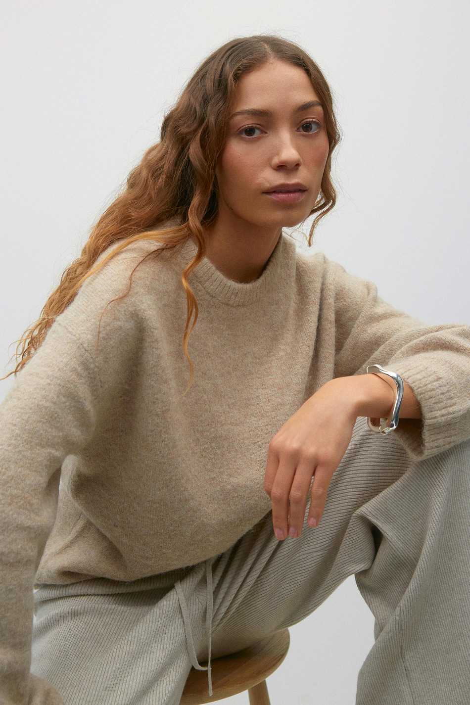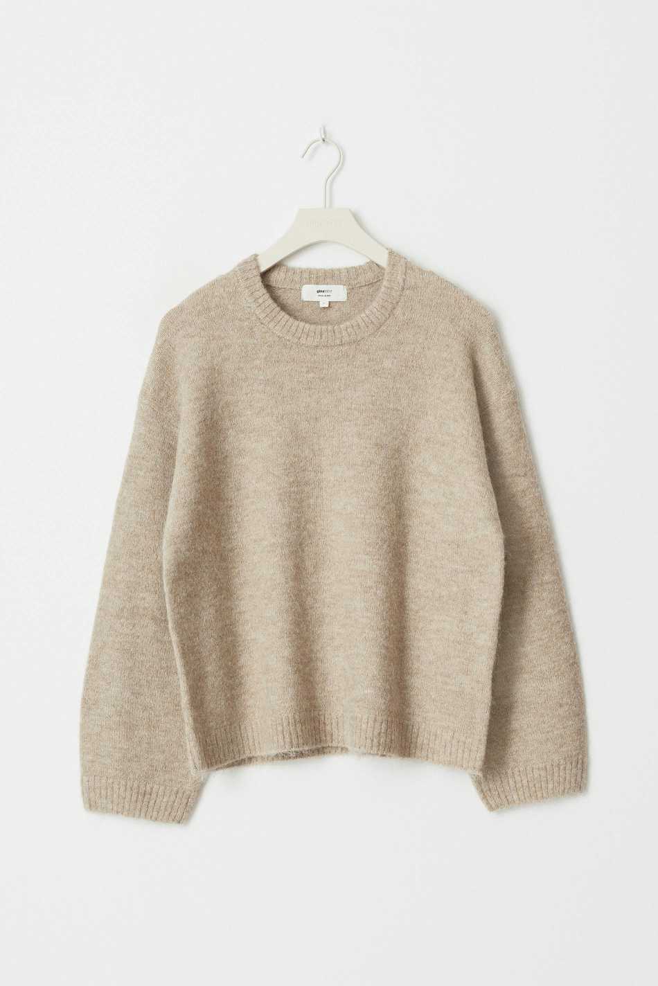 Knitted sweater with round neckline. The sweat is beige and has oversize fit. It has balloon sleeve, regular length and rib knit at sleeve ends and at the bottom.