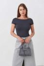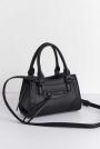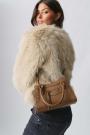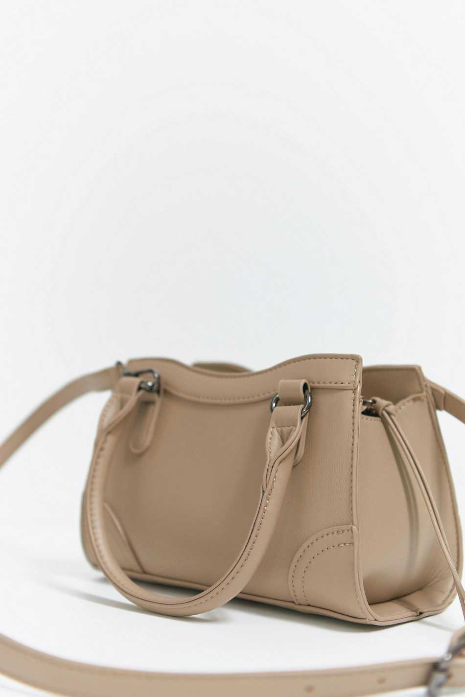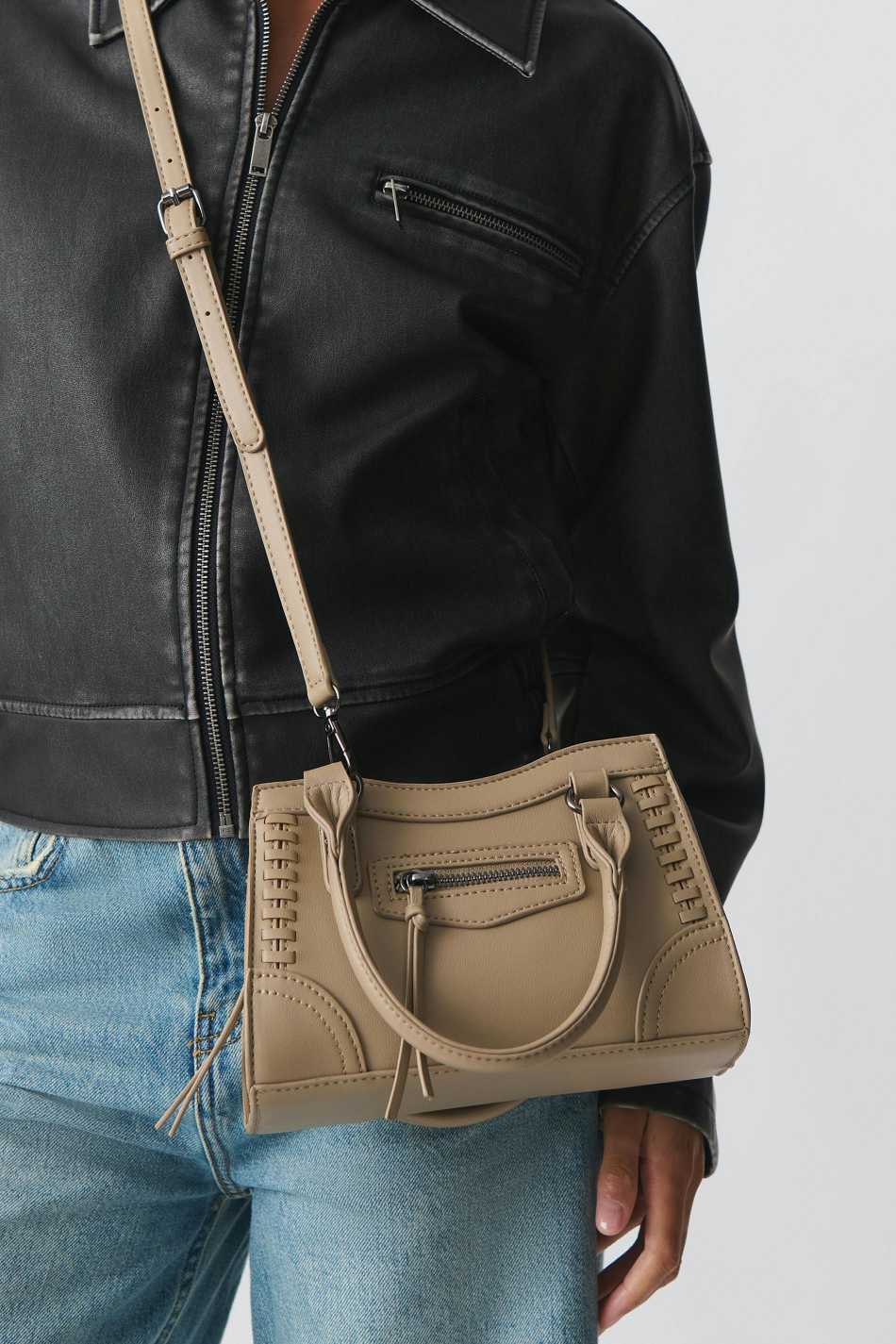 Bag in imitation leather with handles at the top. The bag is beige and has metal details. It has long, adjustable shoulder strap and closure with zip.