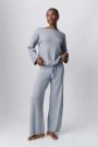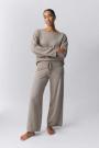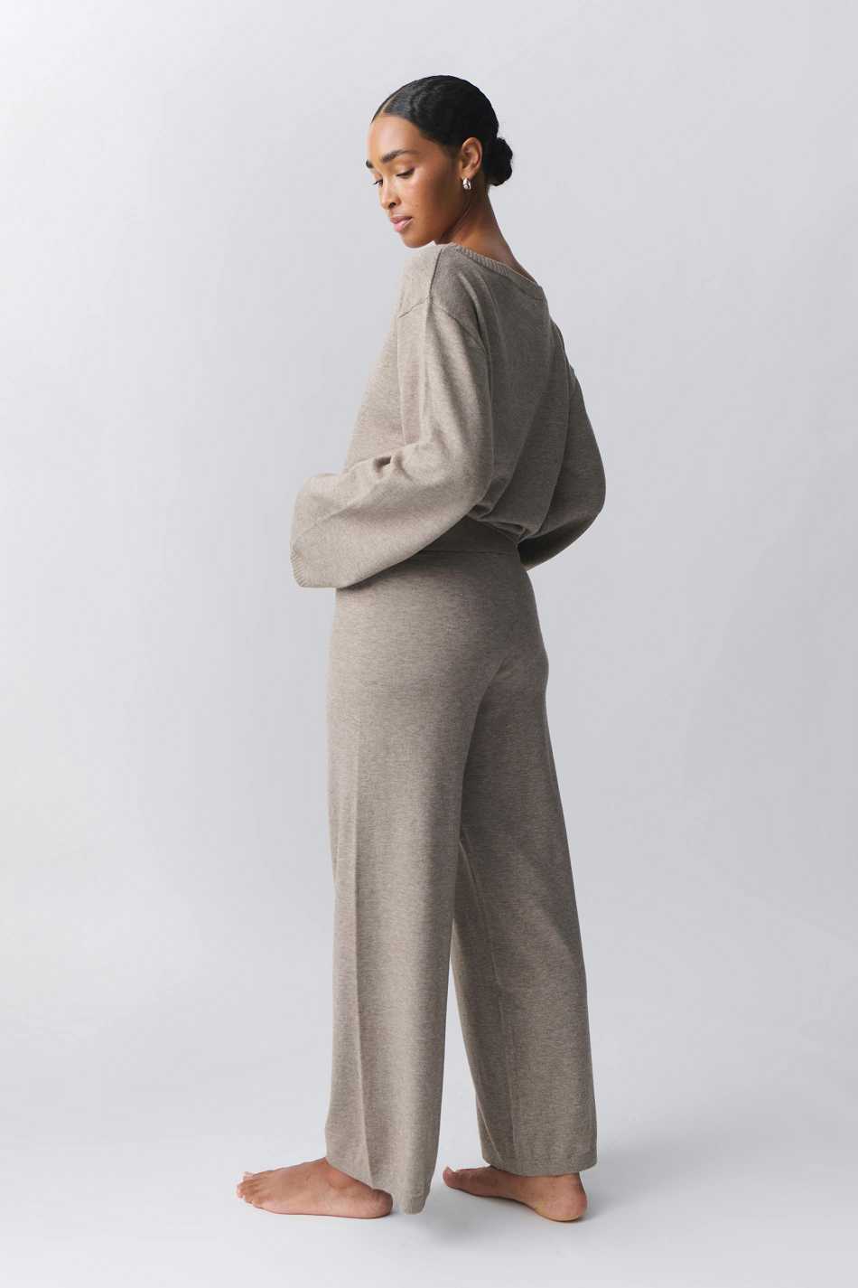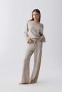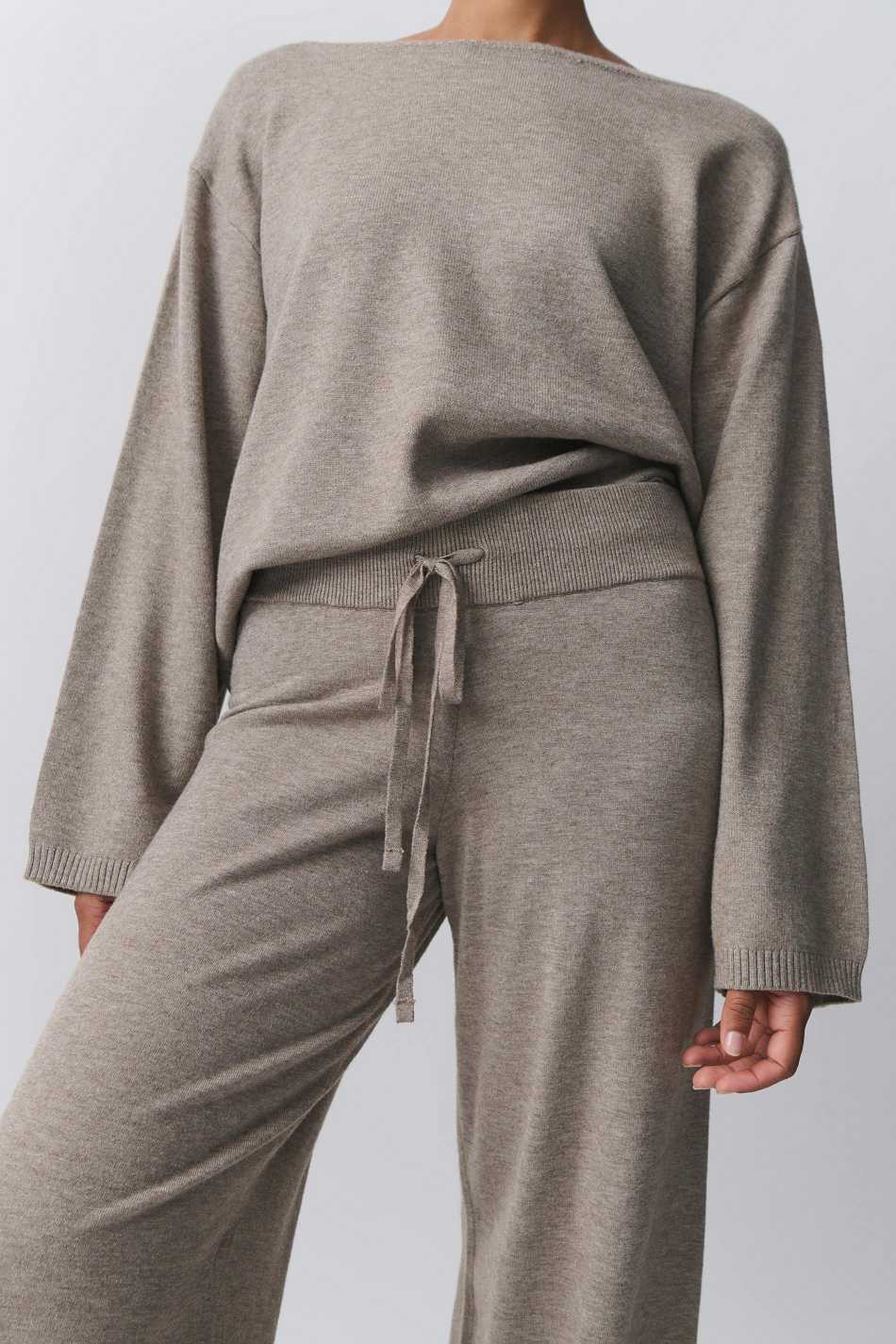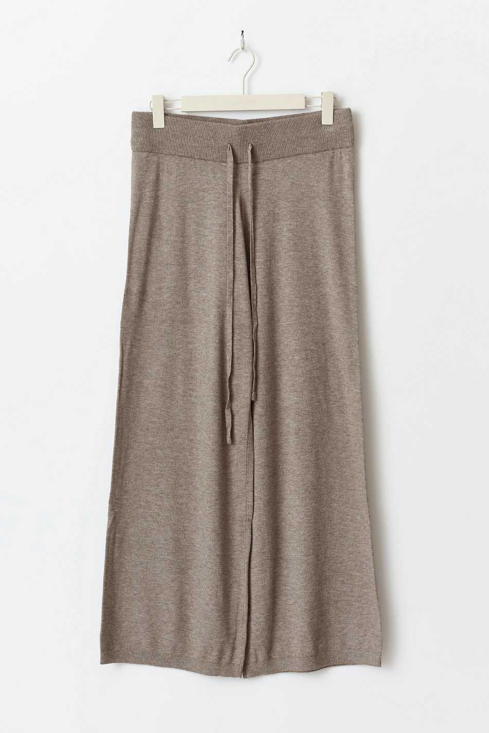Knitted trousers with elastic at the waist. The trousers are beige and have wide legs. They have mid waist and self-tie at the front.