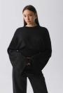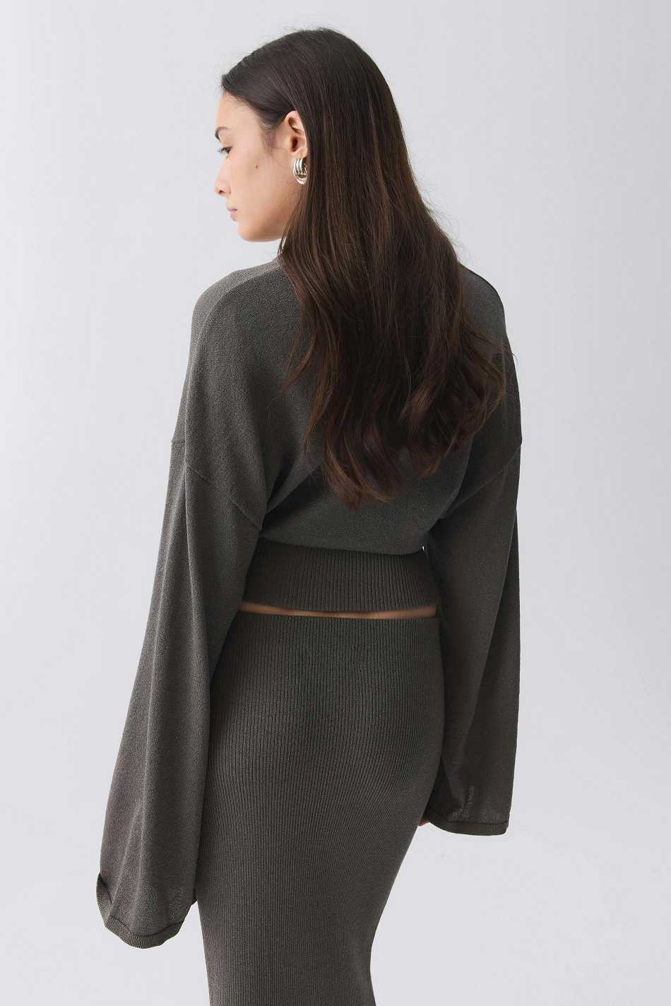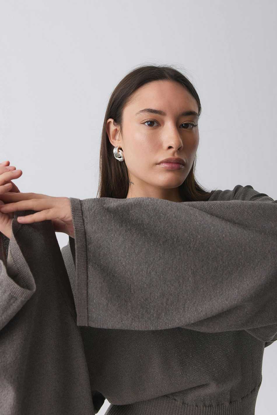Knitted sweater in metallic fibre with round neckline. The sweat is beige and has wide, ribbed cuff at the bottom. It has long sleeve, regular fit, dropped shoulder and tight fitting waist.