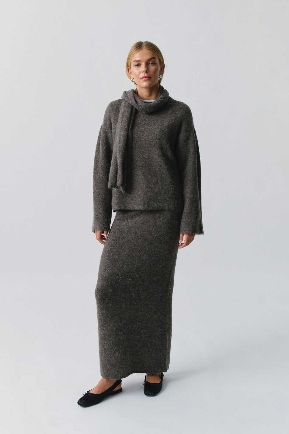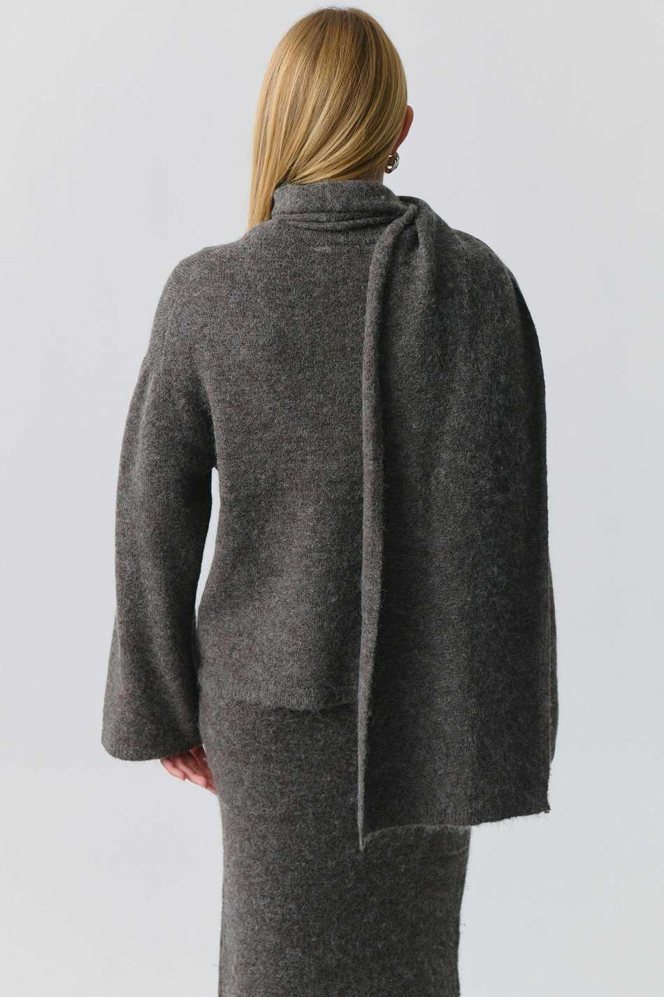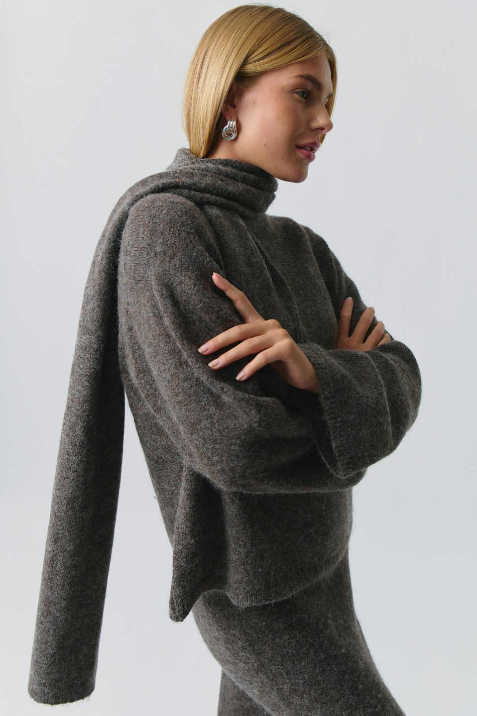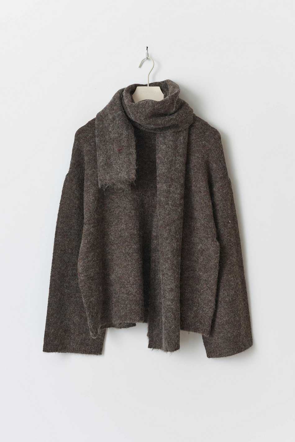 Knitted sweater with detachable scarf. The sweat is brown and has oversize fit. It has long sleeve and dropped shoulder.