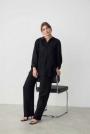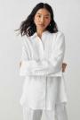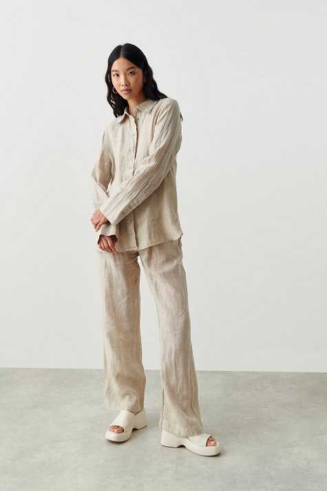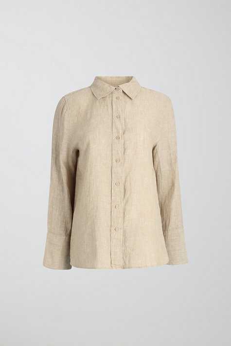 Linen shirt with oversize fit. The shirt is beige and has button placket in front. It has collar, yoke with pleats at the back and long sleeve with button and cuff.