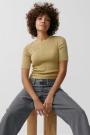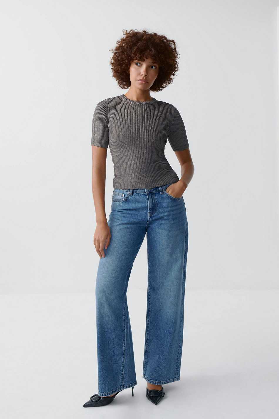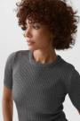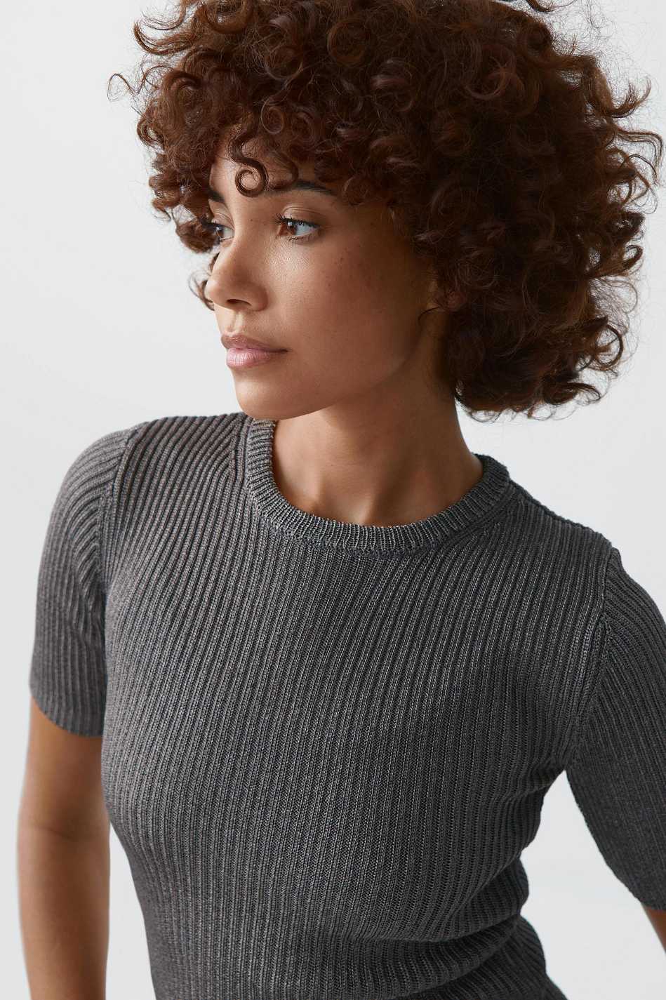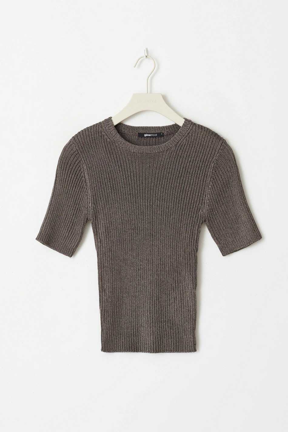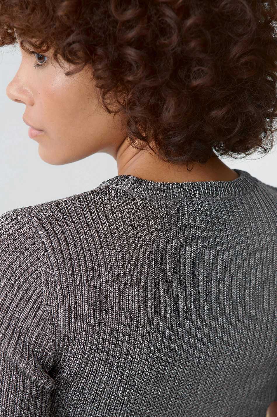 Knitted t-shirt in metallic fibre with short sleeve. The t-shirt is silver coloured and has round neckline.