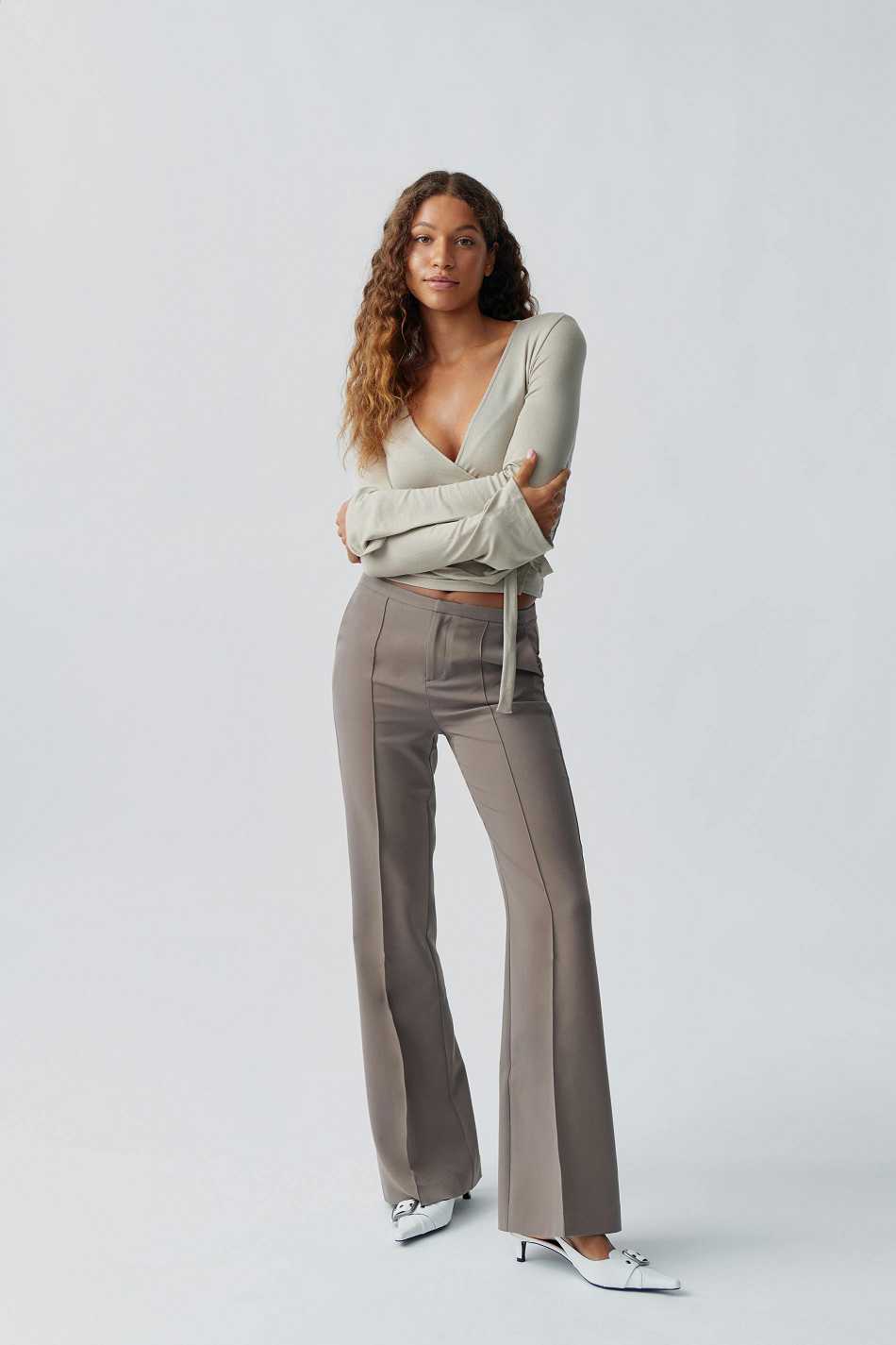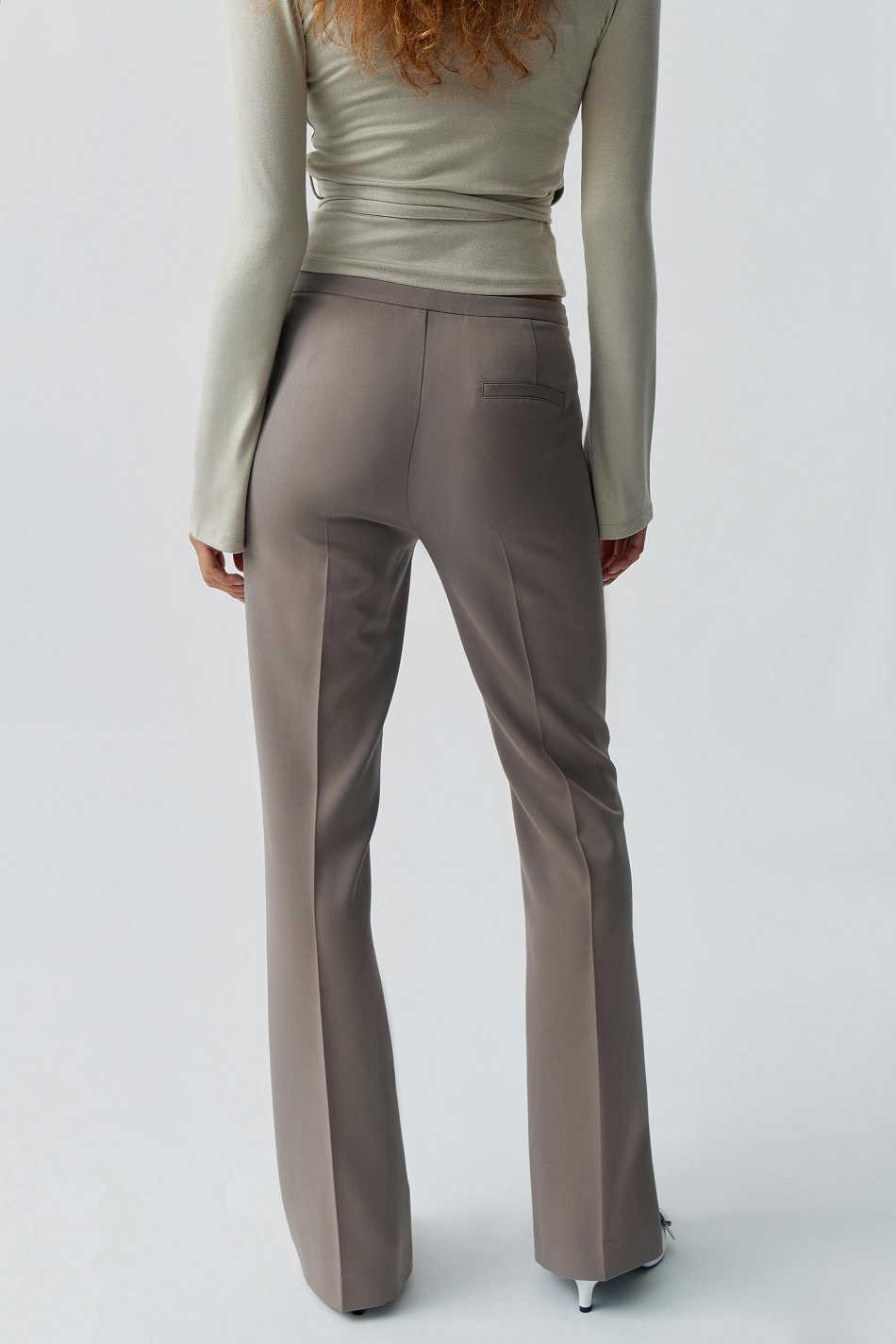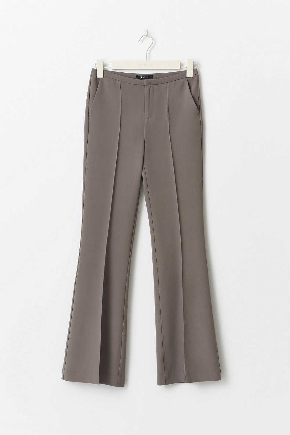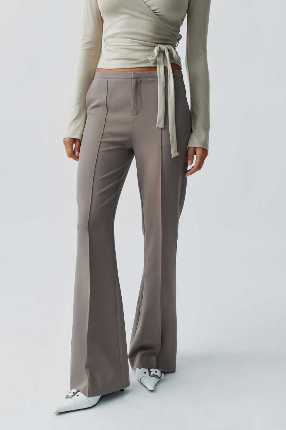 Flared suit trousers with creases at the front. The trousers are beige and have pockets in the sides. They have mid waist, zip fly, hook-and-eye closure and back pocket.