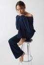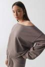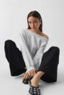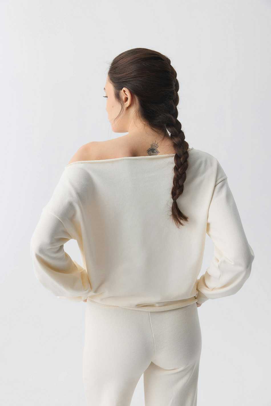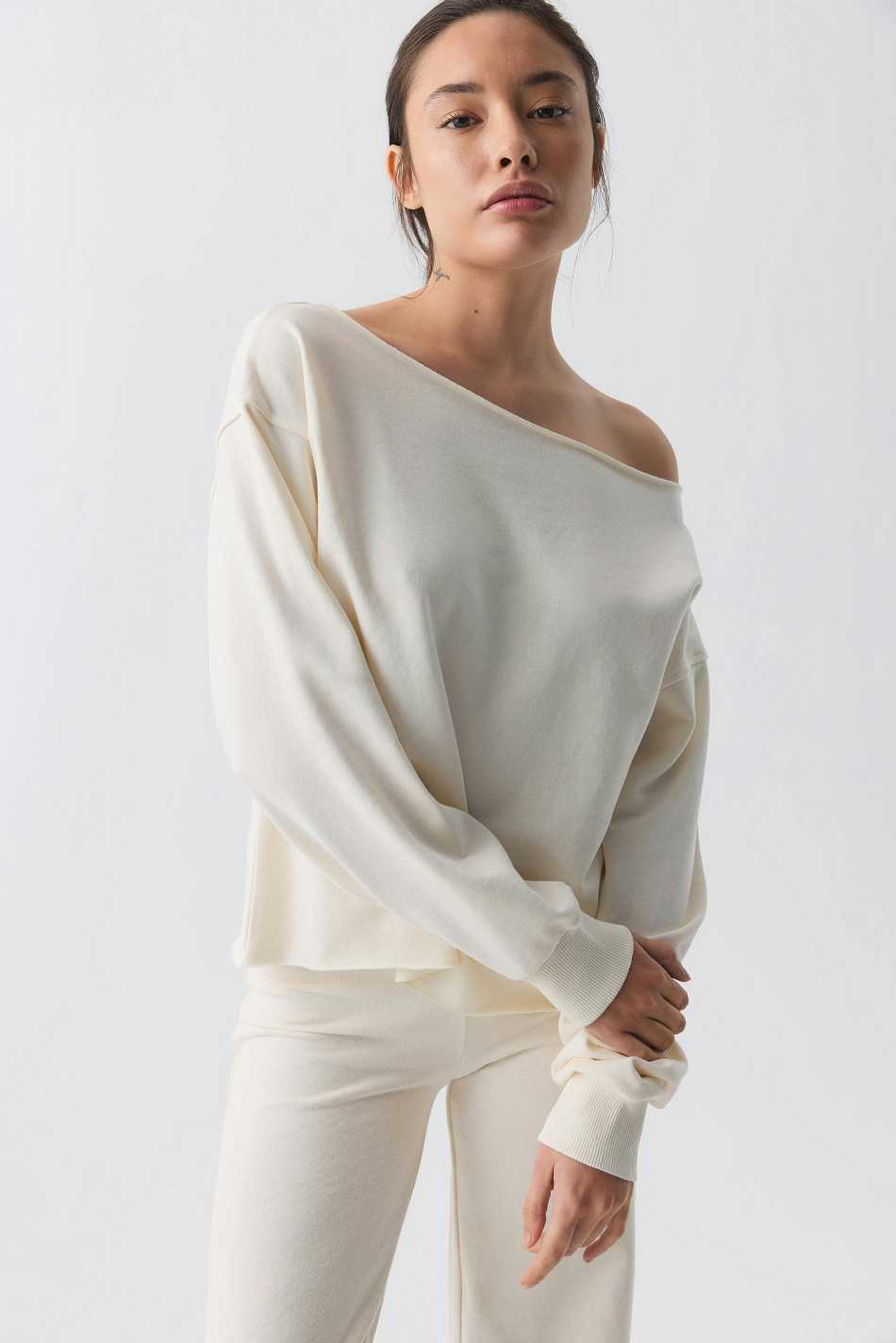 Sweat with one shoulder design. The sweat is white and has oversize fit. It has boat neckline, raw edges and ribbing at sleeve ends.