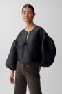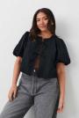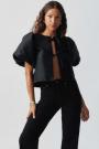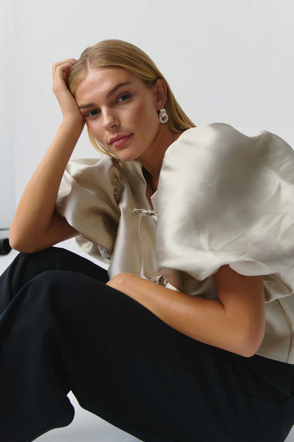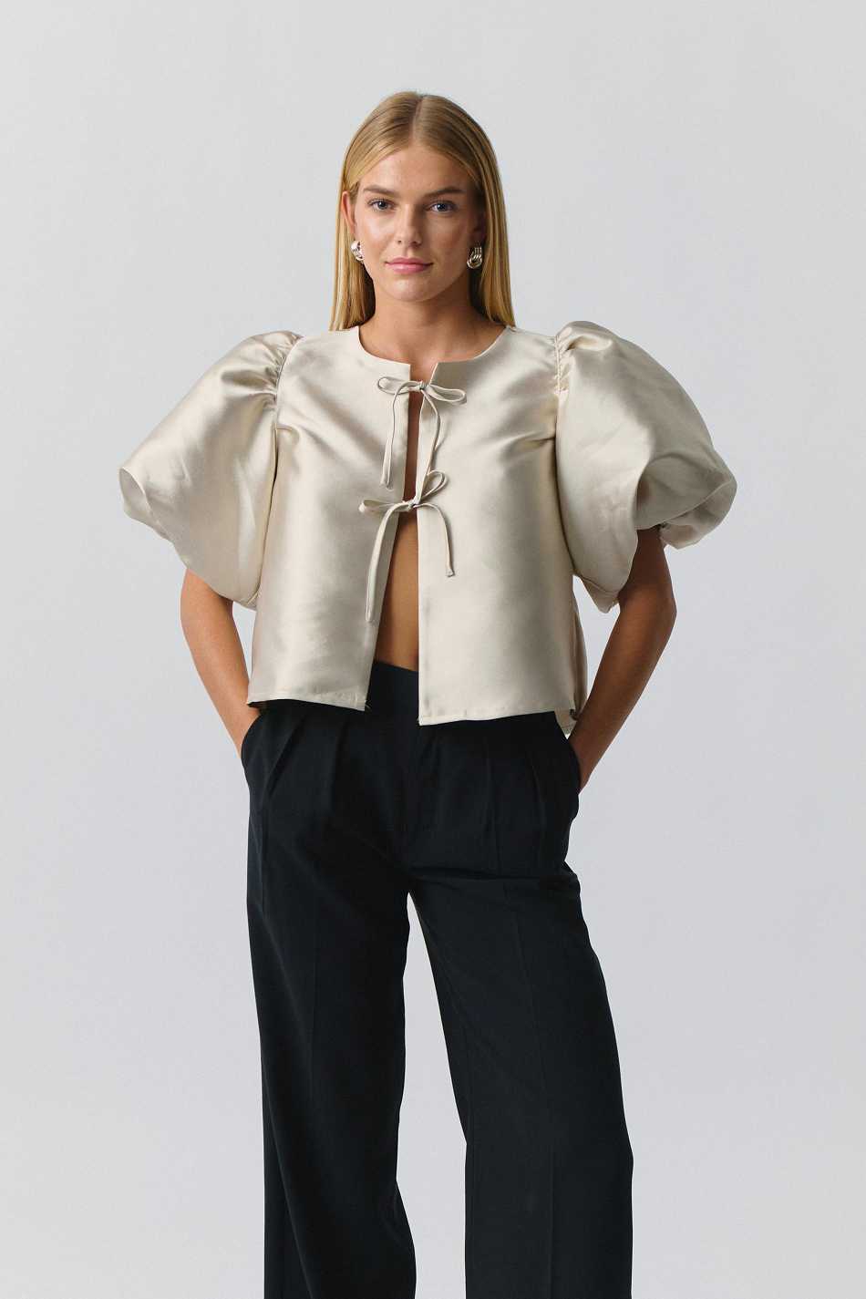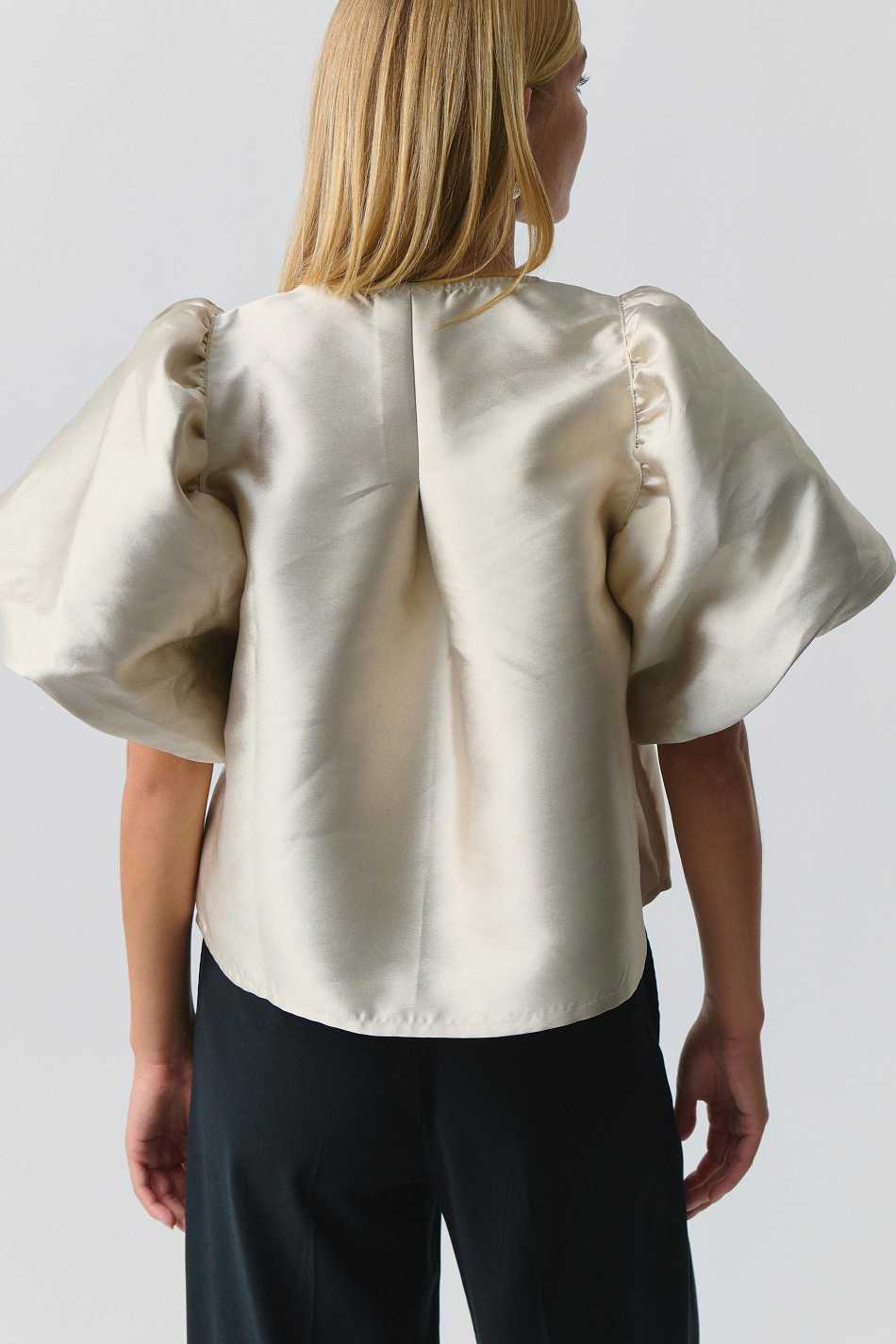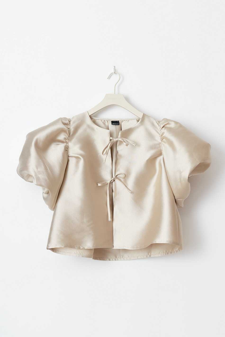 Blouse with short puff sleeve. The blouse is beige and has self-tie at the front. It has normal fit, round neckline and shiny quality.