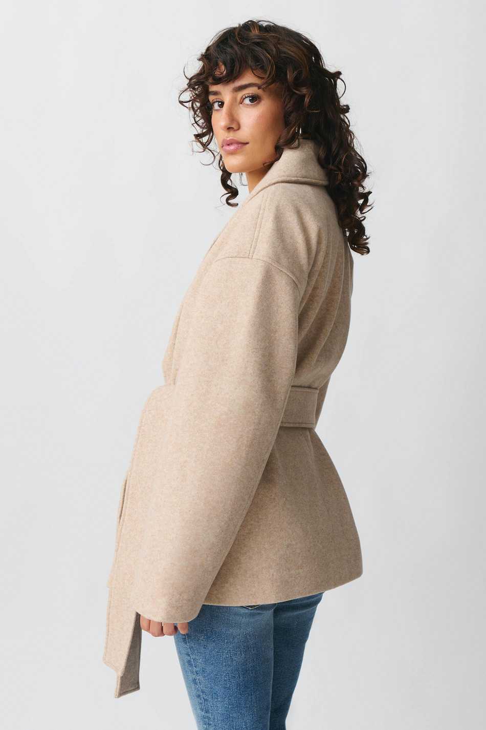 Short coat with self-tie belt at the waist. The coat is beige and has shawl collar. It has long sleeve and pockets in the sides. Lined.