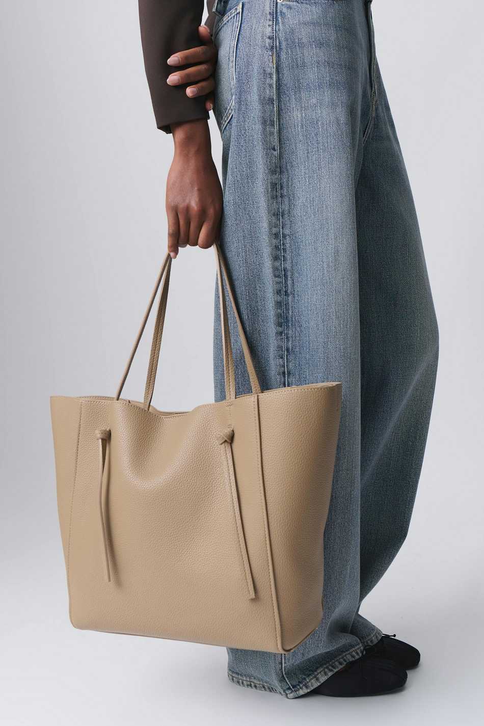 Big bag with magnetic closure. The bag is beige and has double handles. The bag is designed with adjustable knots on both sides, making it easy to customize its size.