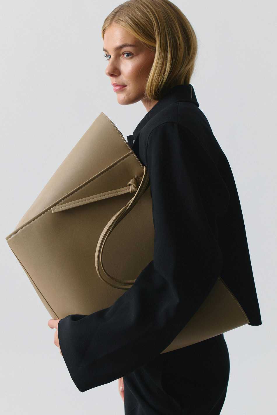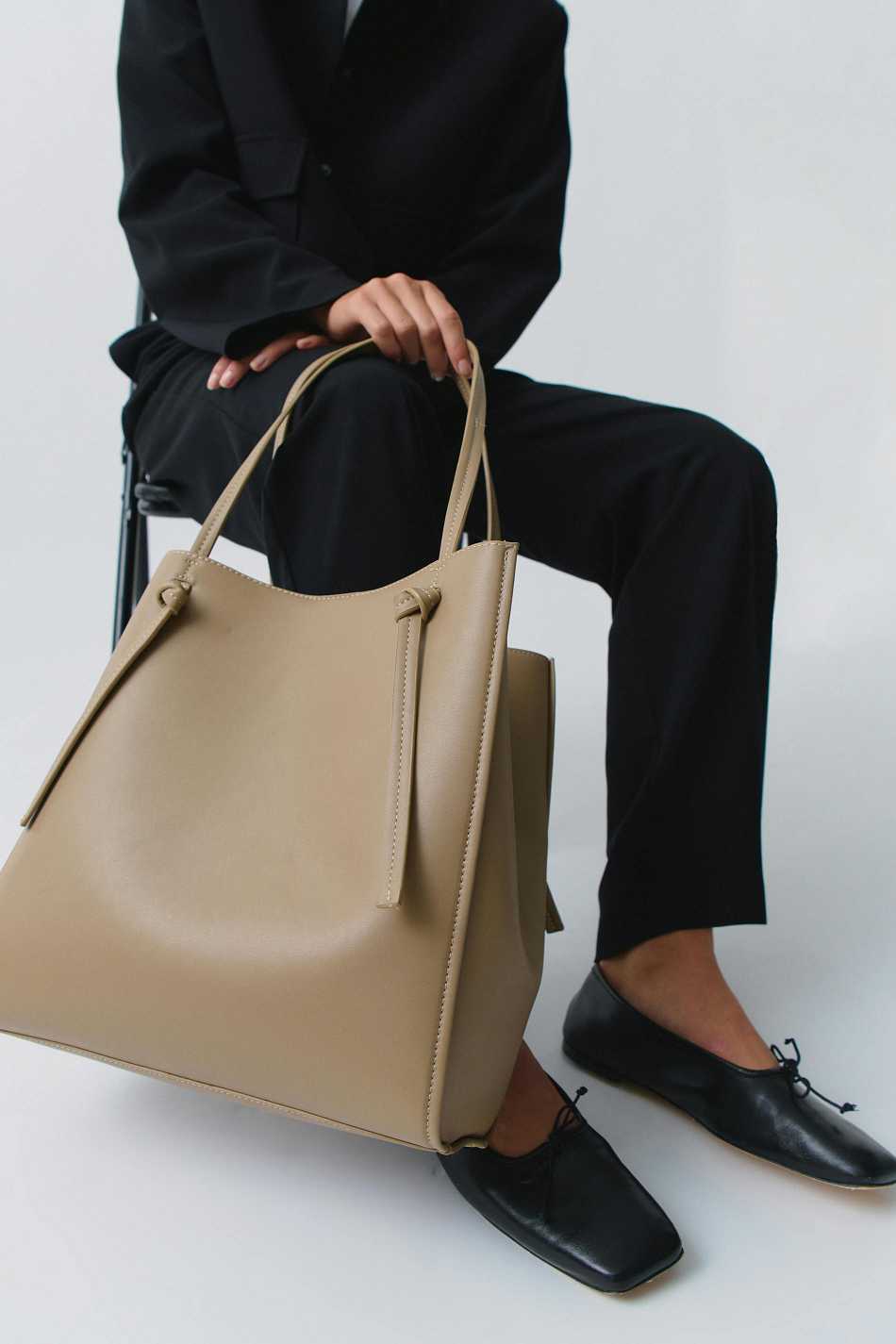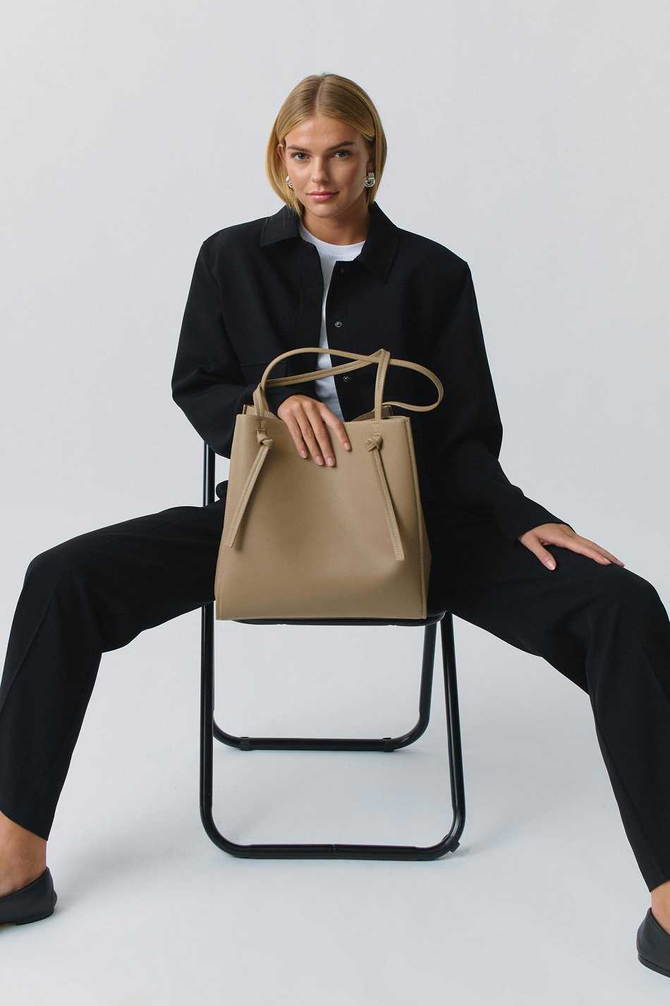 Big bag in imitation leather with spacious main compartment. The bag is beige and has adjustable handles with knots. It has magnetic closure.