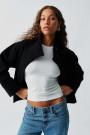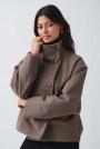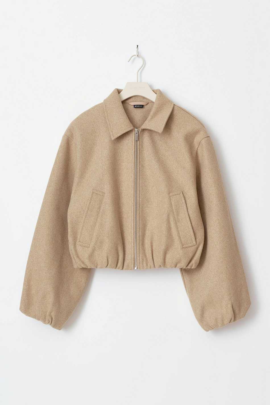 Short jacket with puff sleeve. The jacket is beige and has collar. It has zip closure at the front, rounded neckline, regular fit, slant pockets in the sides and elastic at the bottom.