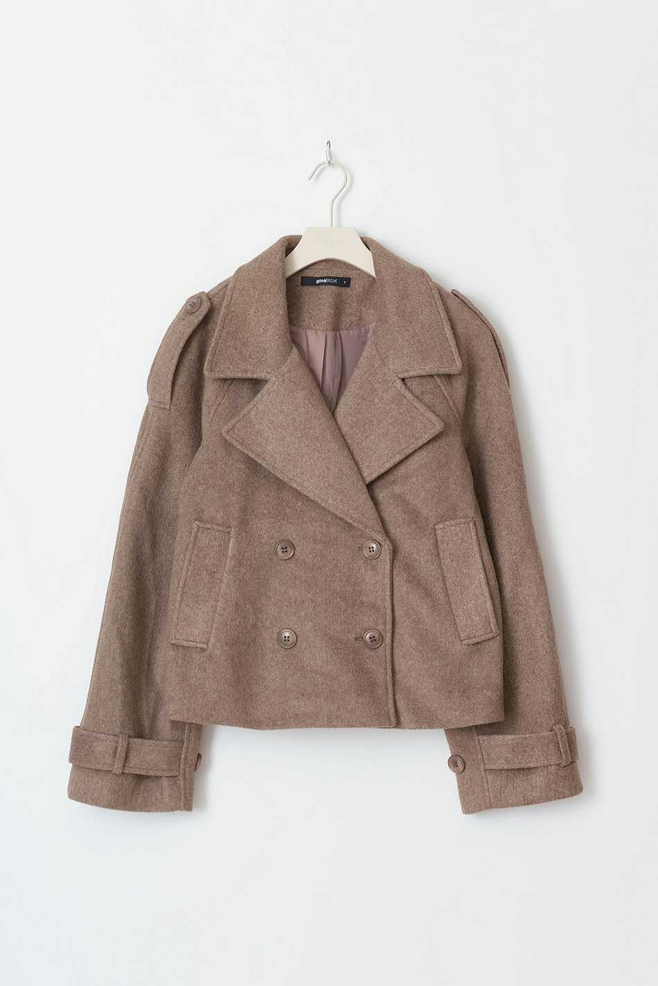 Short trenchcoat with double button closure at the front. The coat is beige and has collar with lapels. It has pockets in the sides, adjustable tab at sleeve ends and shoulder tabs.
