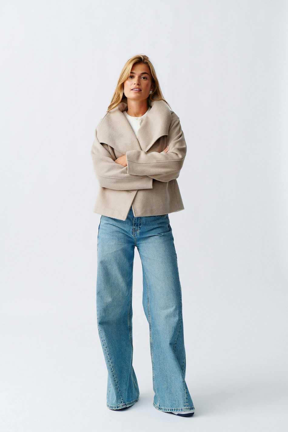 Short jacket with funnel neck. The jacket is beige and has buttoning at the front. It has regular fit, long sleeve and side pockets. Fully lined.