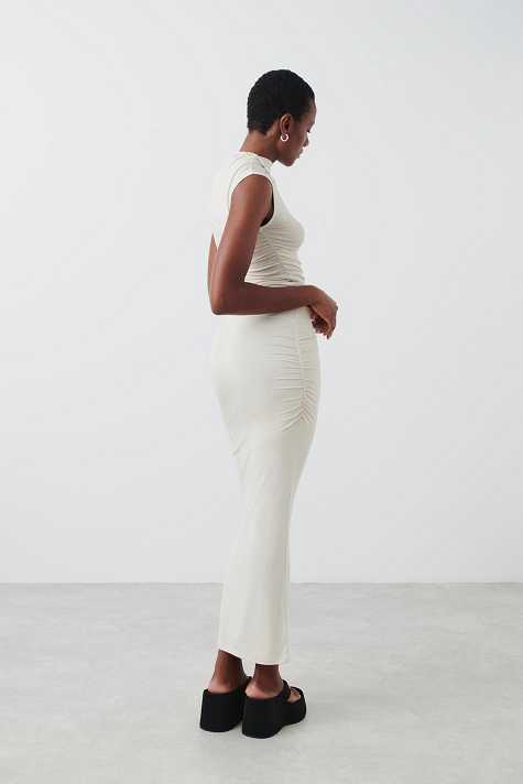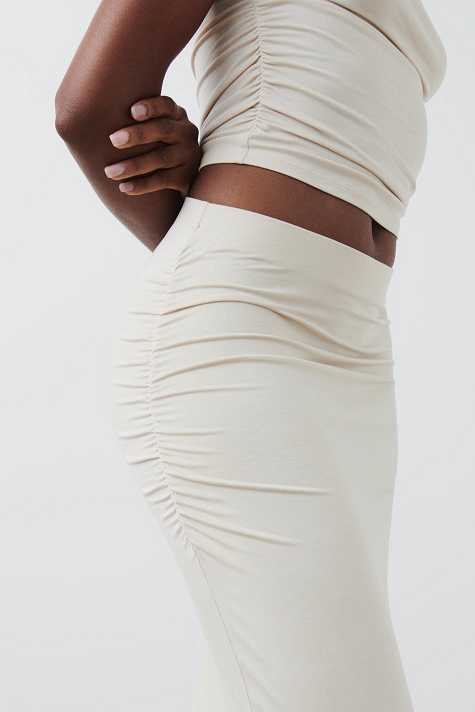 Soft touch – second skin comfort. Midi skirt in soft viscose with ruching in the sides. The skirt is beige and has figure-hugging fit.