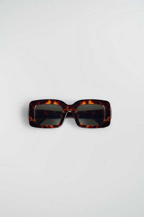 Rectangular sunglasses with a big plastic frame. The sunglasses are brown, yellow and black.