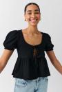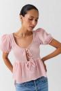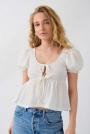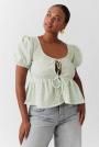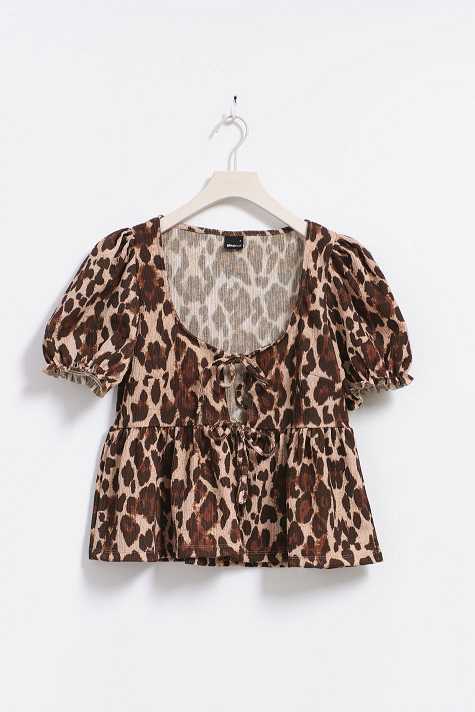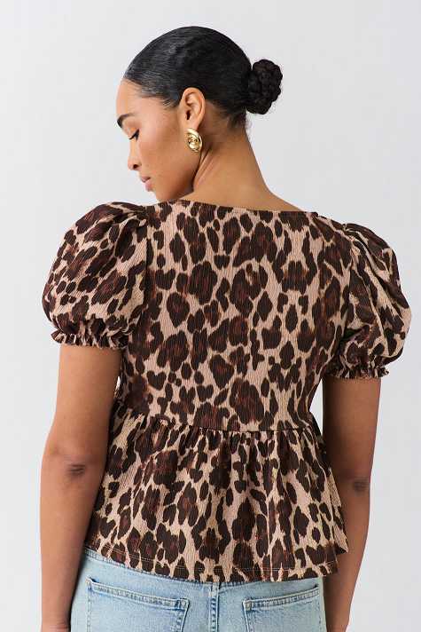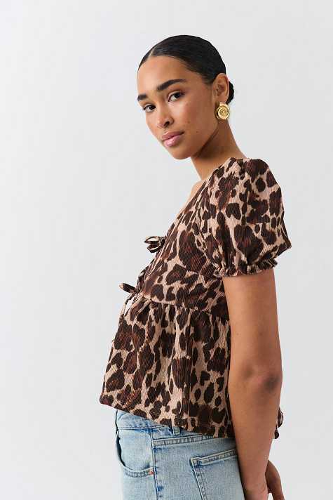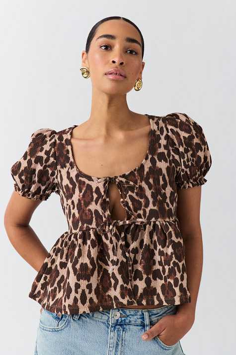 Leopard patterned top with short puff sleeve. The top is beige and has string tie closure at the front. It has u-neck, textured material, gathered seam below the bust and frill at the bottom.