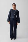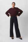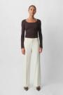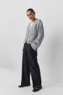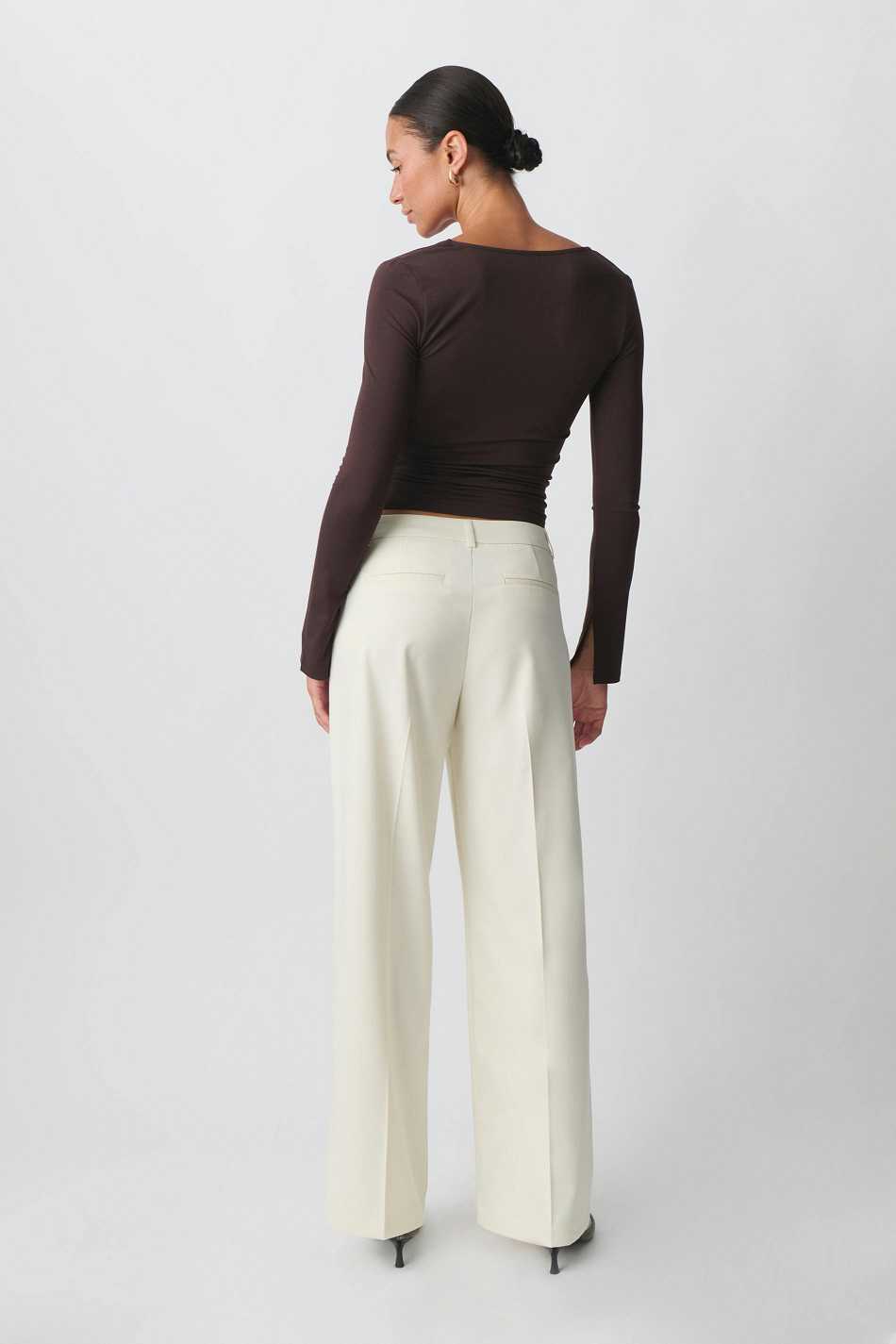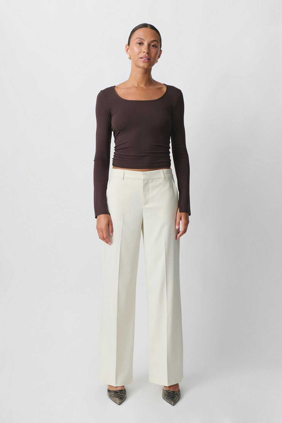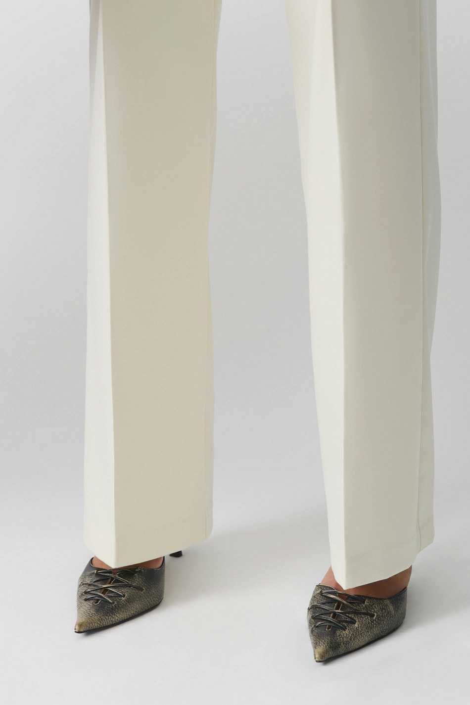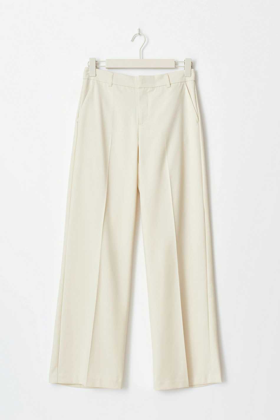 Wide suit trousers with creases at the front. The trousers are beige and have pockets in the sides. They have zip fly and belt loops.