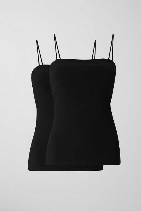 2-pack camisoles with thin shoulder straps. The camisoles are black and have longer fit.