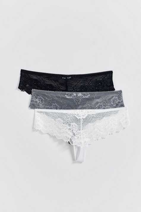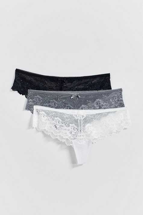 Thongs in lace with crotch lining. The thongs are black, white and grey. They have bow detail at the front.