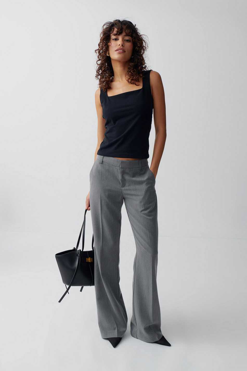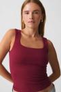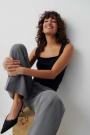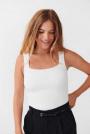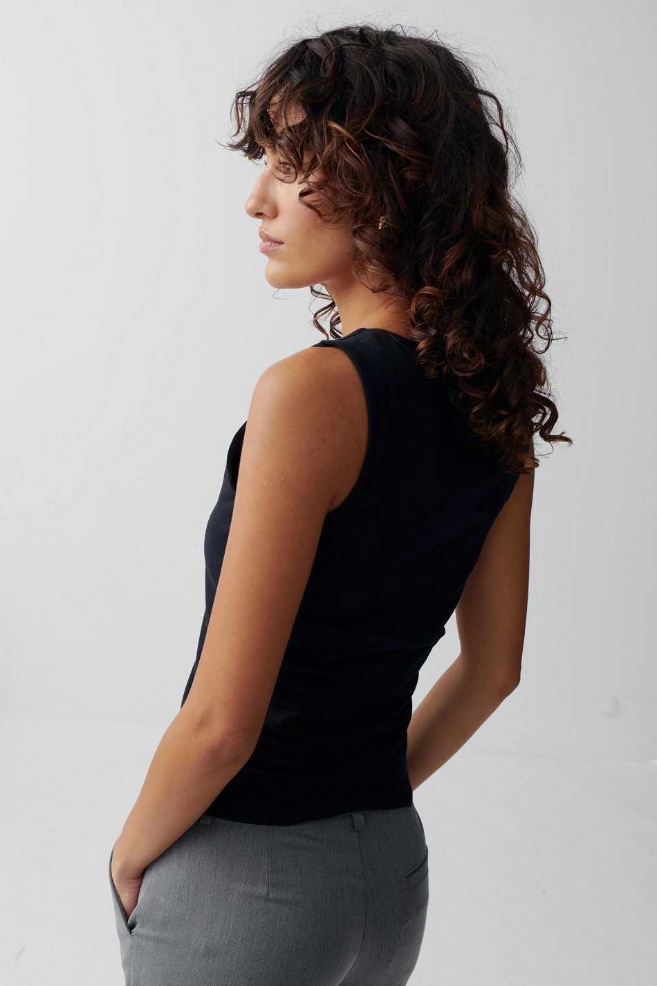 Tank with square neckline. The tank is black and has wide shoulder straps. It has figure-hugging fit, lined bust and cropped length.