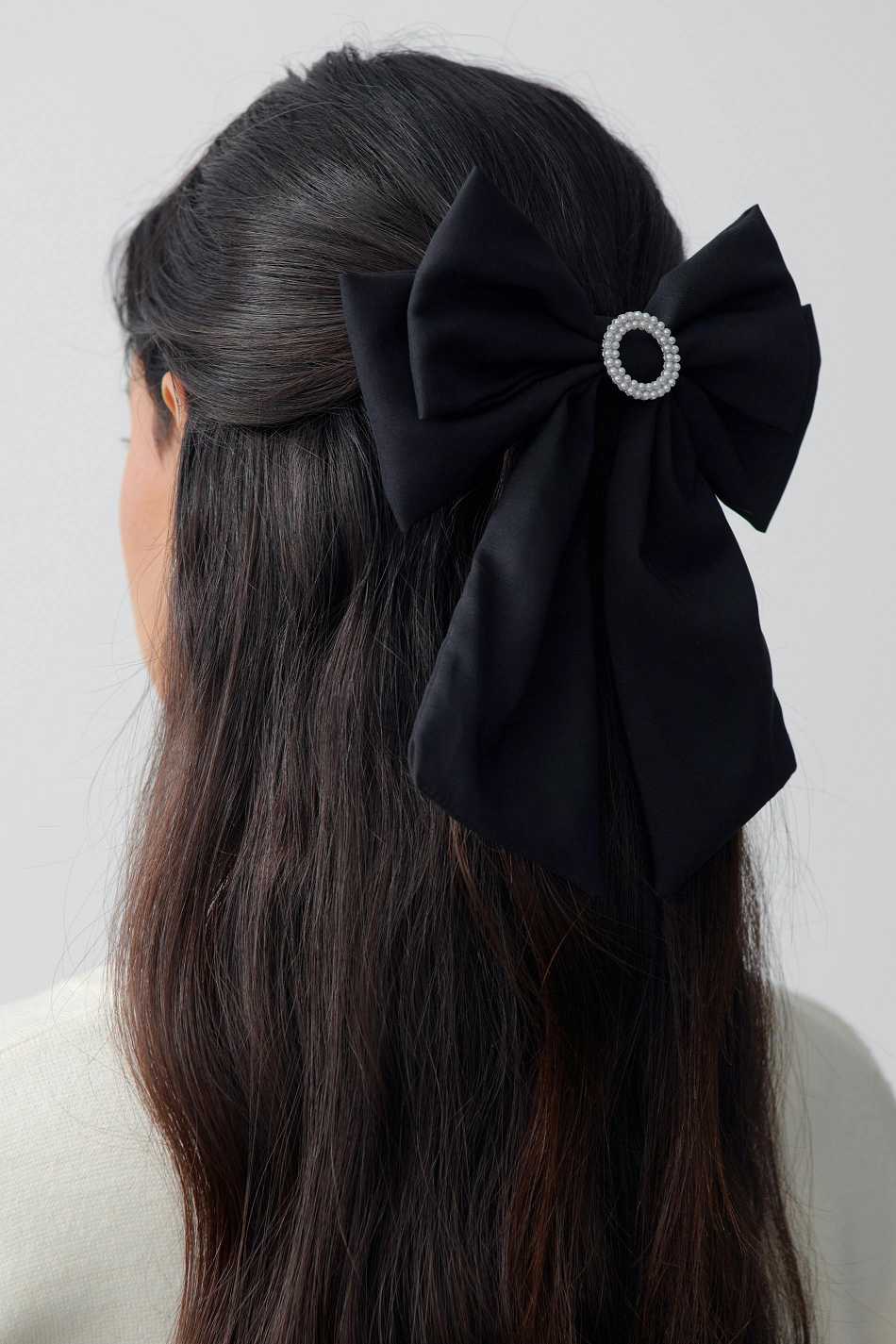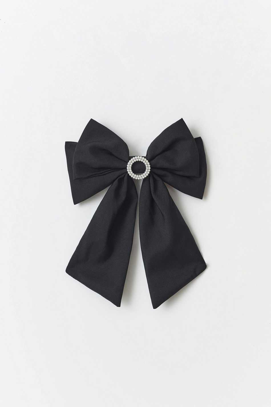 Bow in velvet with hair clip at the back. The bow is black and has decorative pearl details.