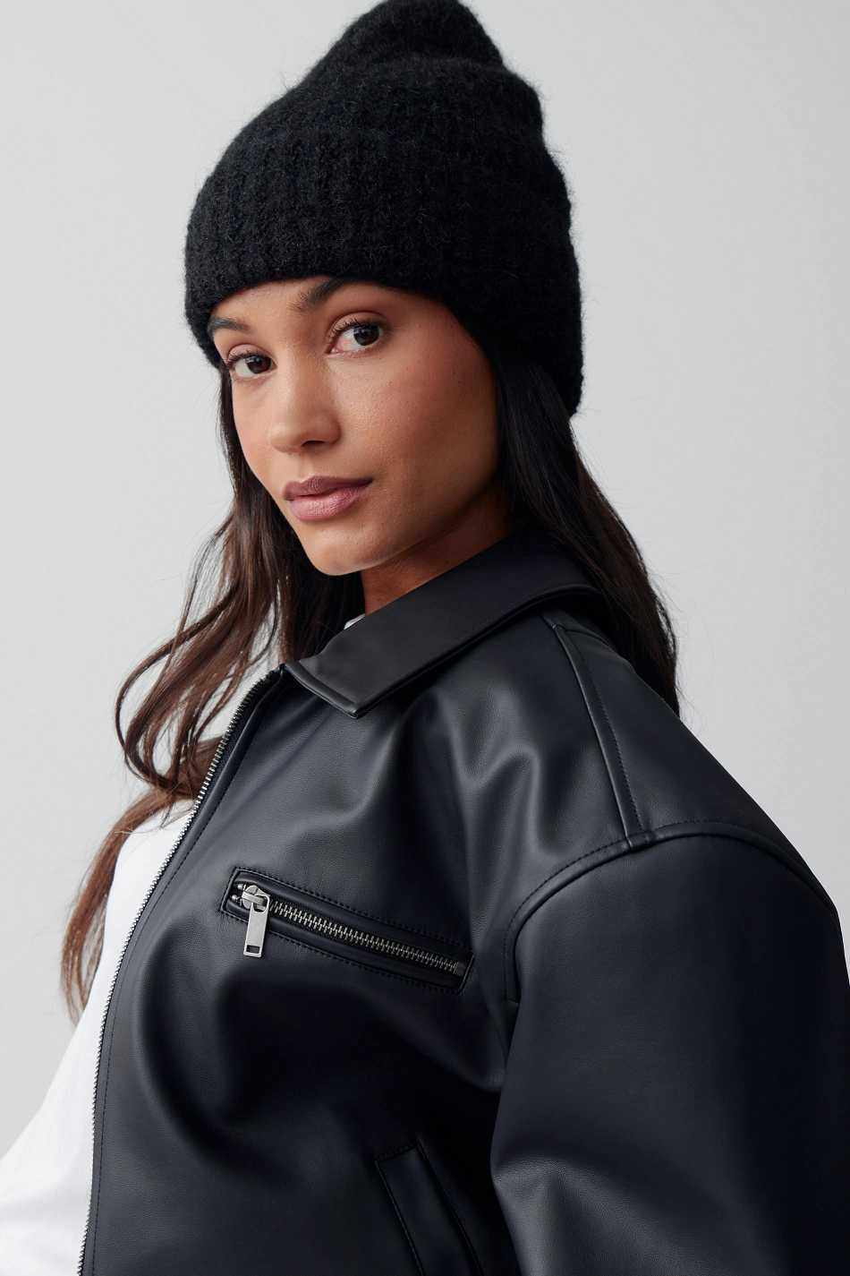 Knitted beanie with wide, fold up edge. The beanie is black.