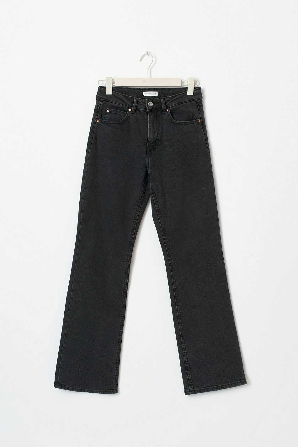 Jeans with straight legs from the knees down. The jeans are black-grey and have stretchy quality. They have regular fit, mid waist, pockets at the front and back, zip fly and longer leg length. Perfect for those who are 175 cm (5 ft 9 in.) or taller. Use our size guide to find your size.