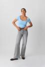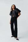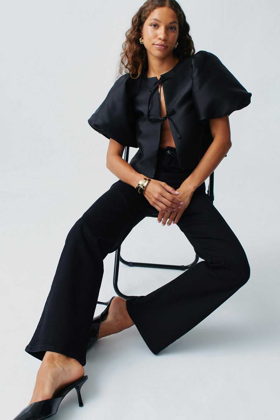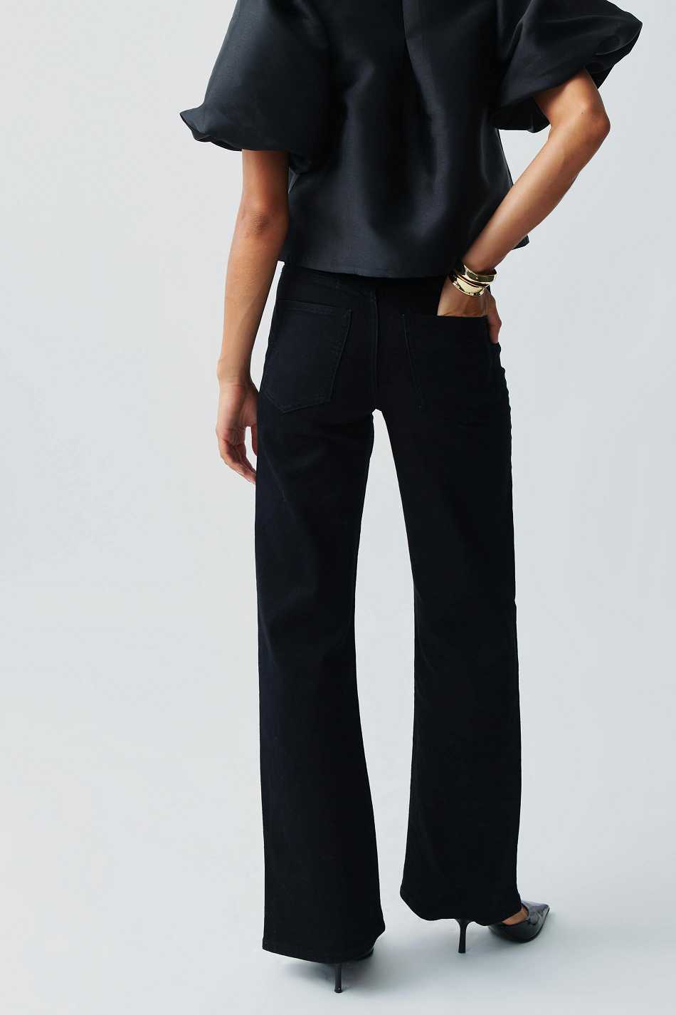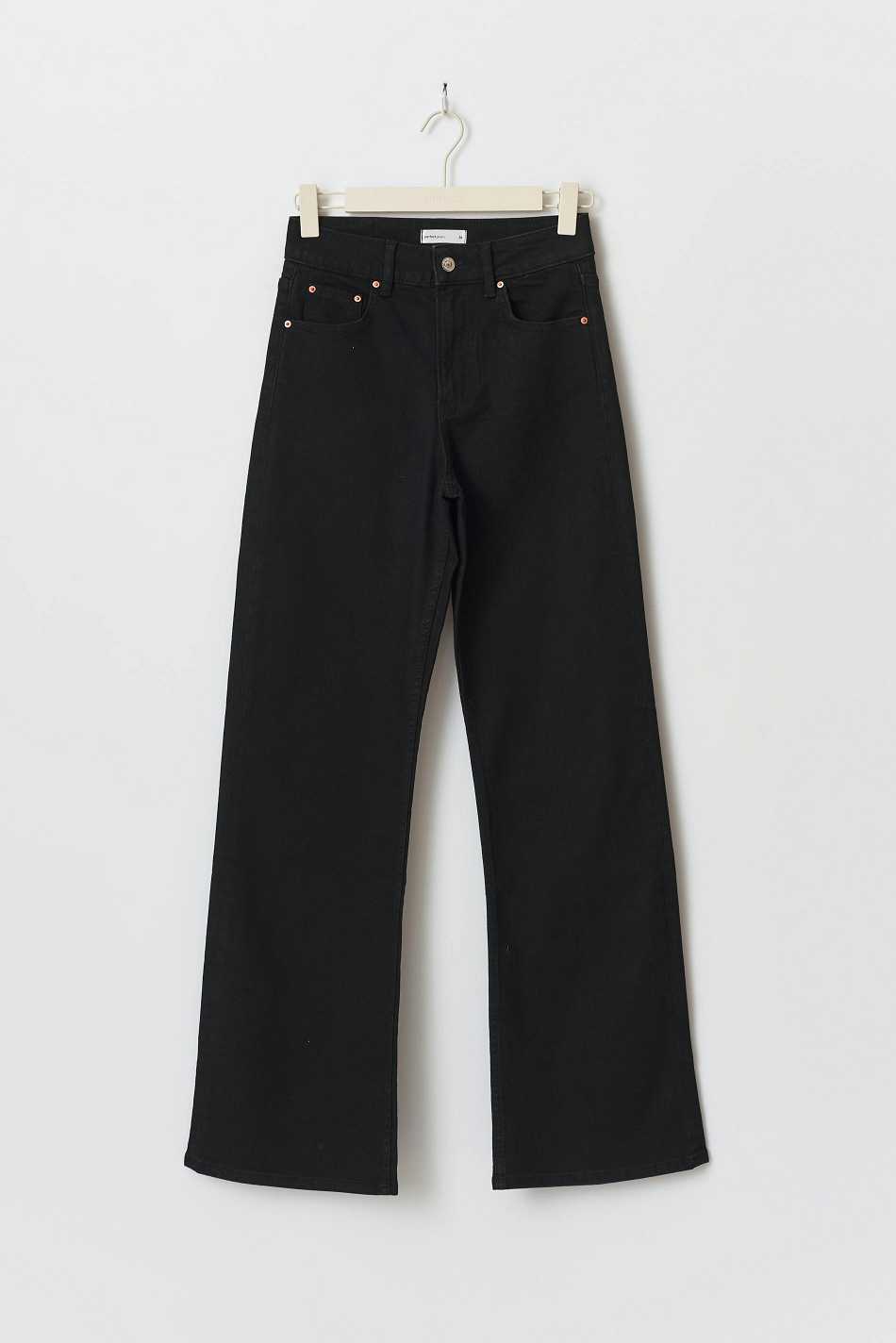Wide jeans with superstretch and high waist. The jeans are black and have comfy, stretchy fit. They have wide legs with full length, zip fly and pockets at the front and back. Use our size guide to find your size.