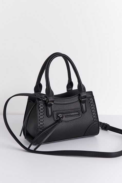 Bag with metal details. The bag is black and has handles at the top. It has a long, adjustable shoulder strap and closure with zip.