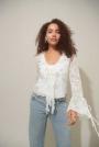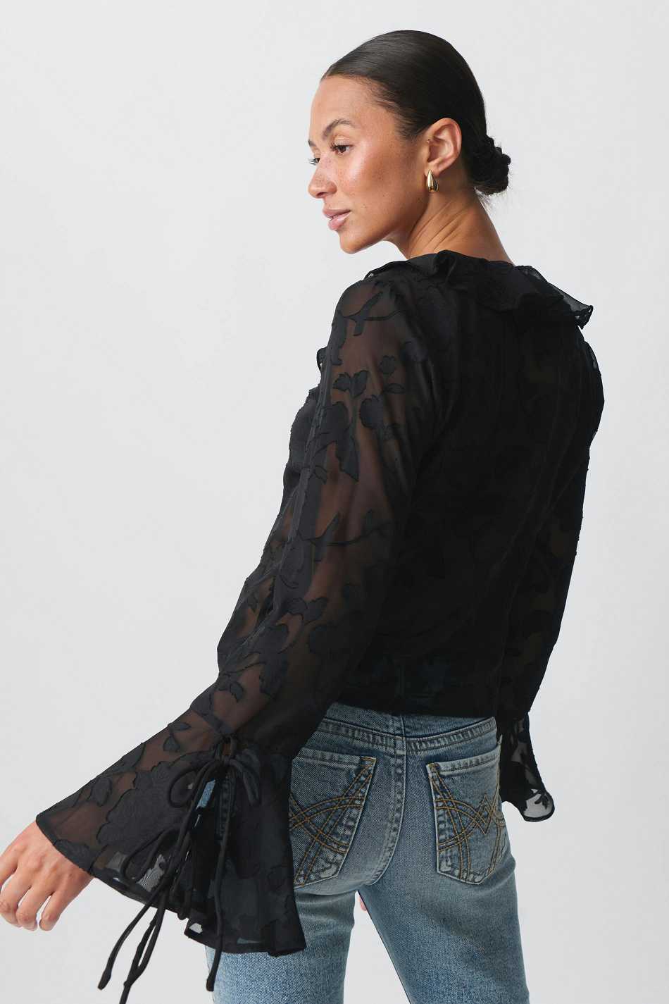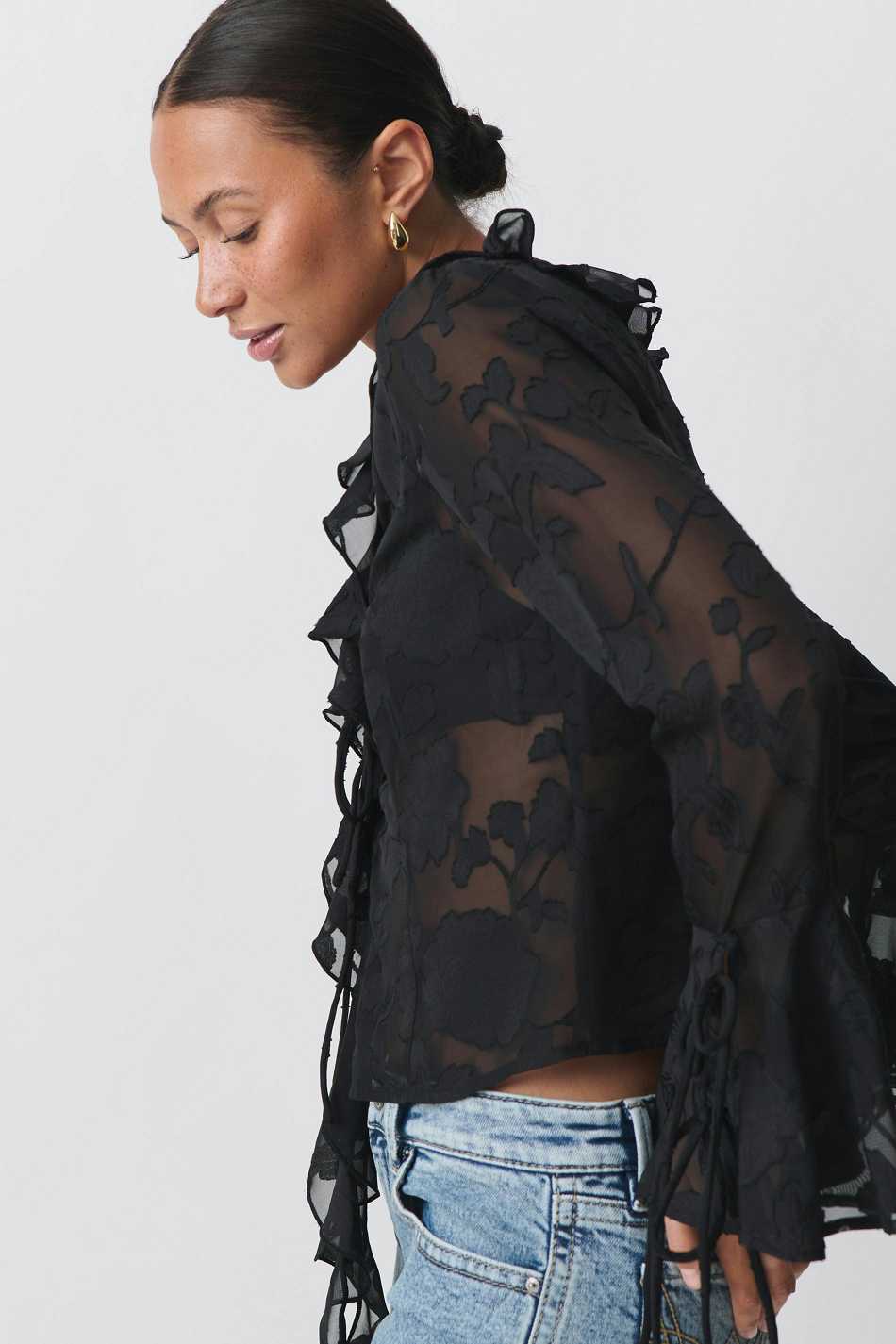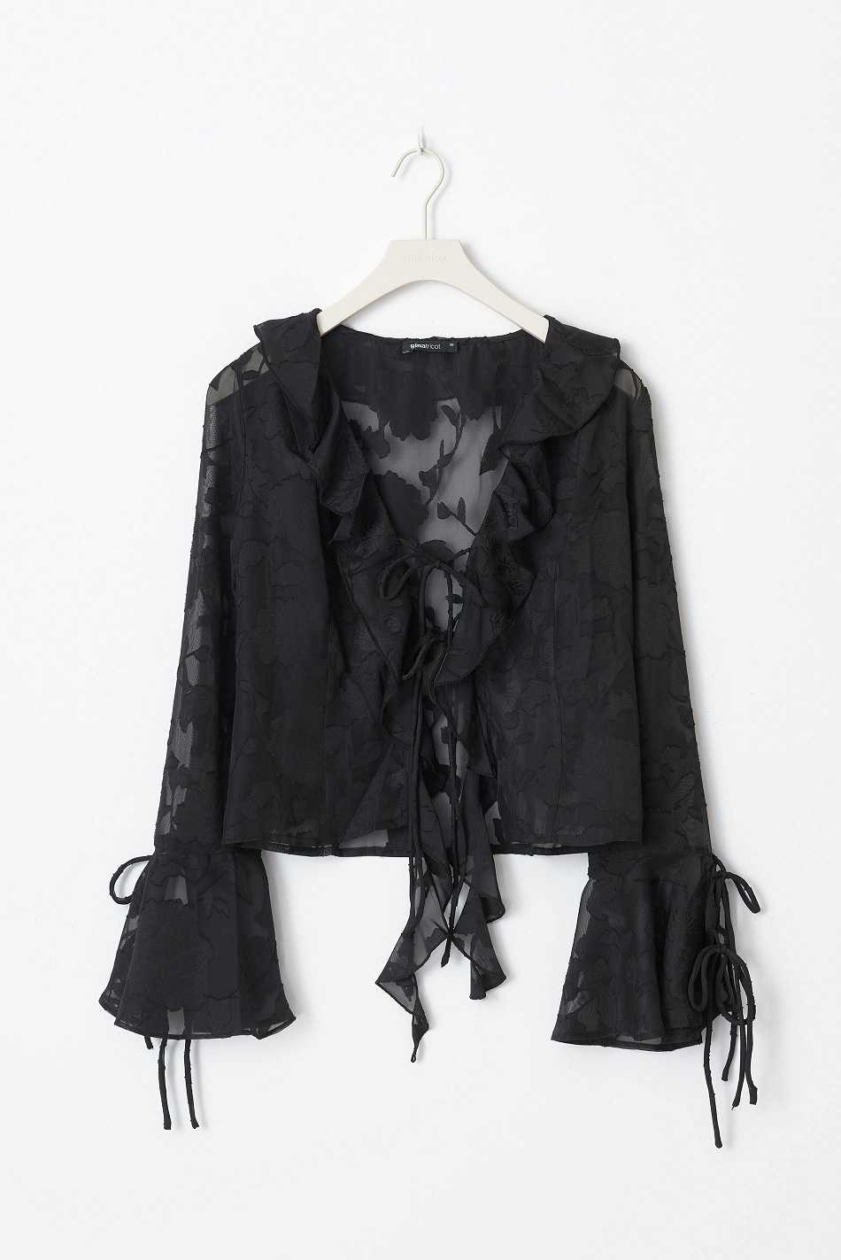 Long-sleeved blouse with frills at the front and at sleeve ends. The blouse is black and has v-neck. It has regular fit, lantern sleeve, regular length and self-tie at the front and at sleeve ends.