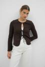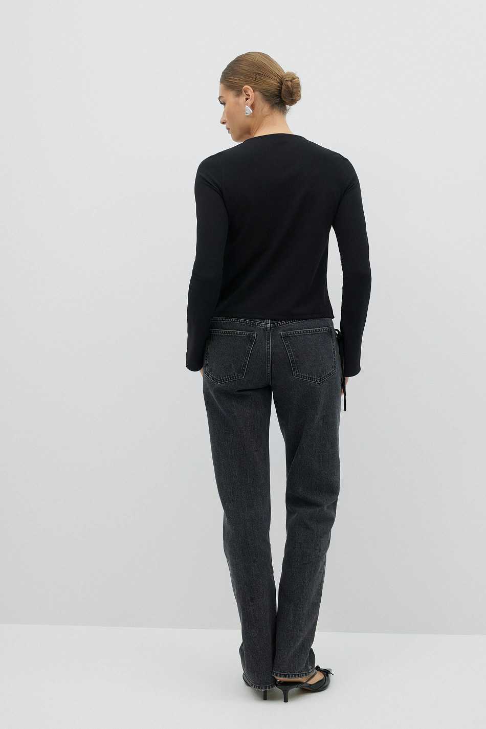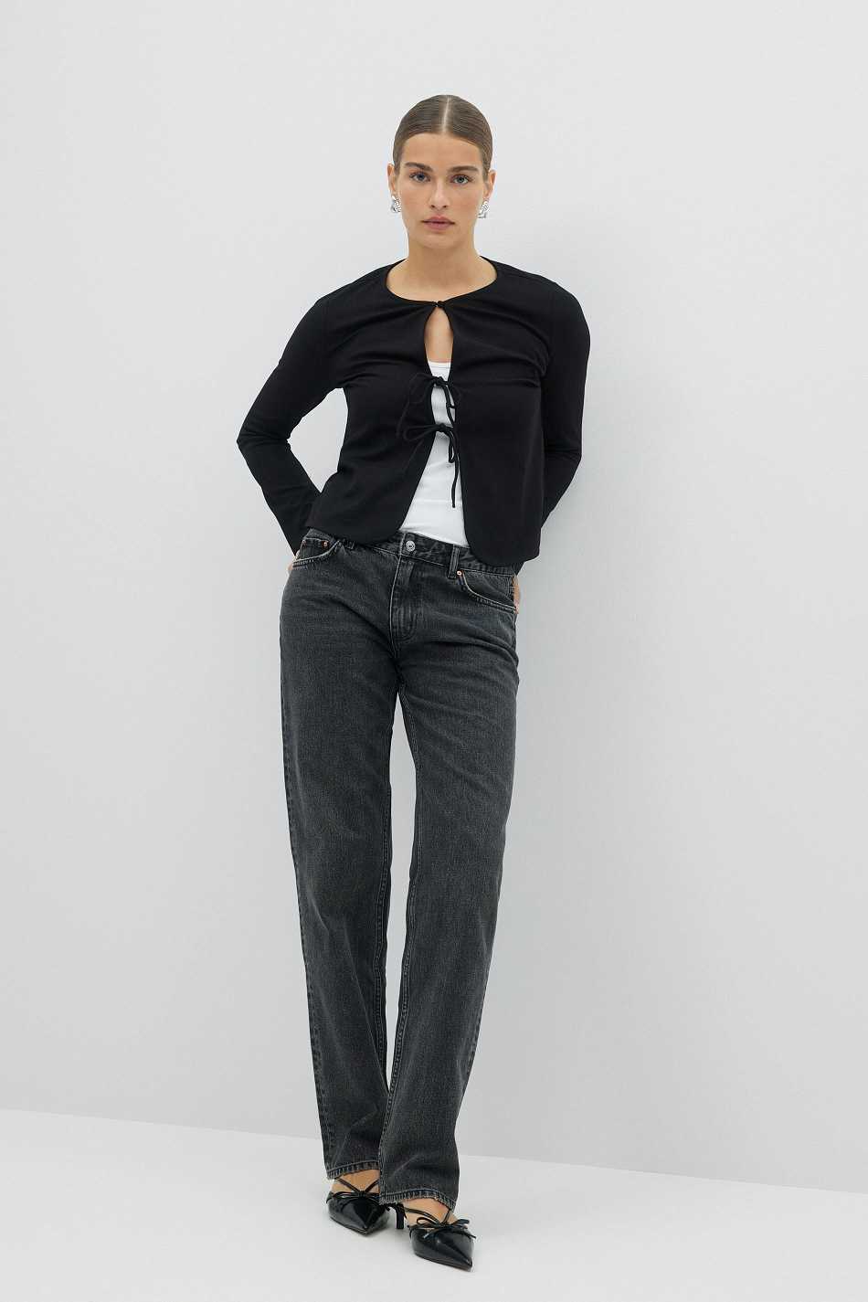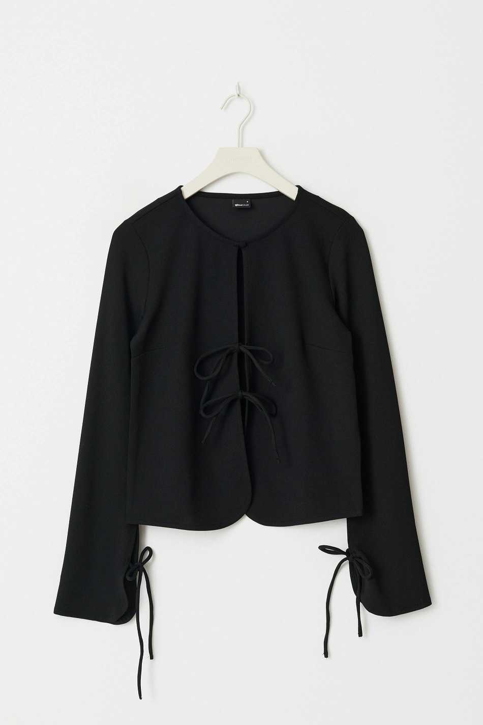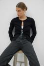 Long sleeve top with string tie closure at the front. The top is black and has a button at the top. It has regular fit, round neckline and self-tie on the sleeve ends.