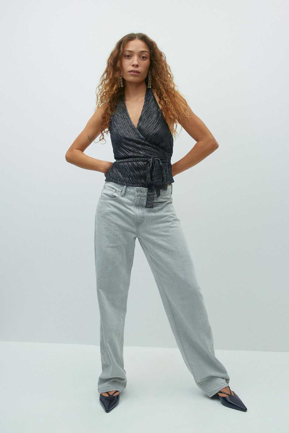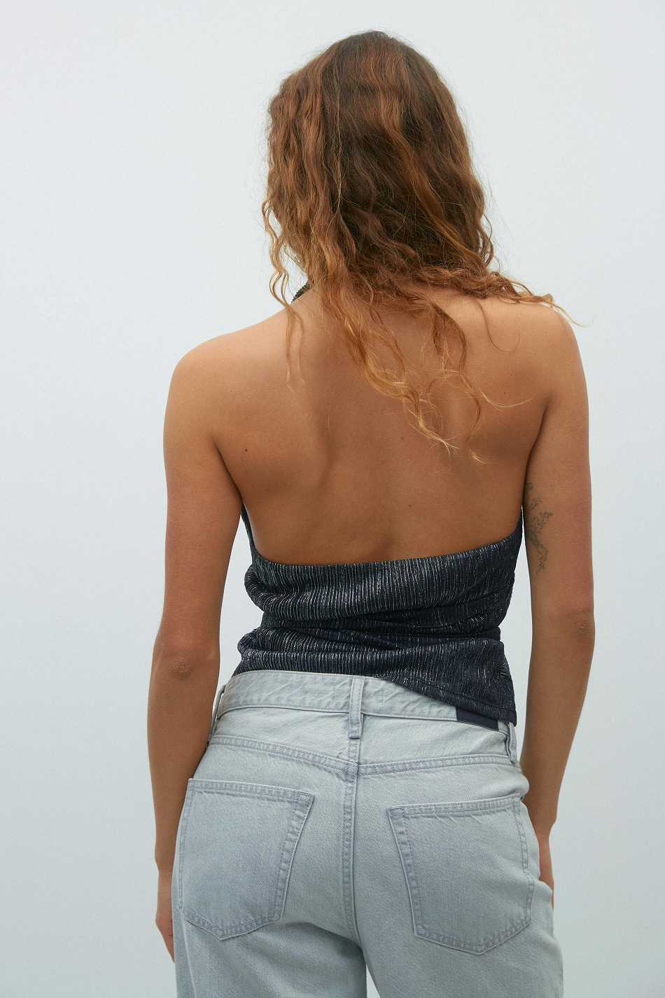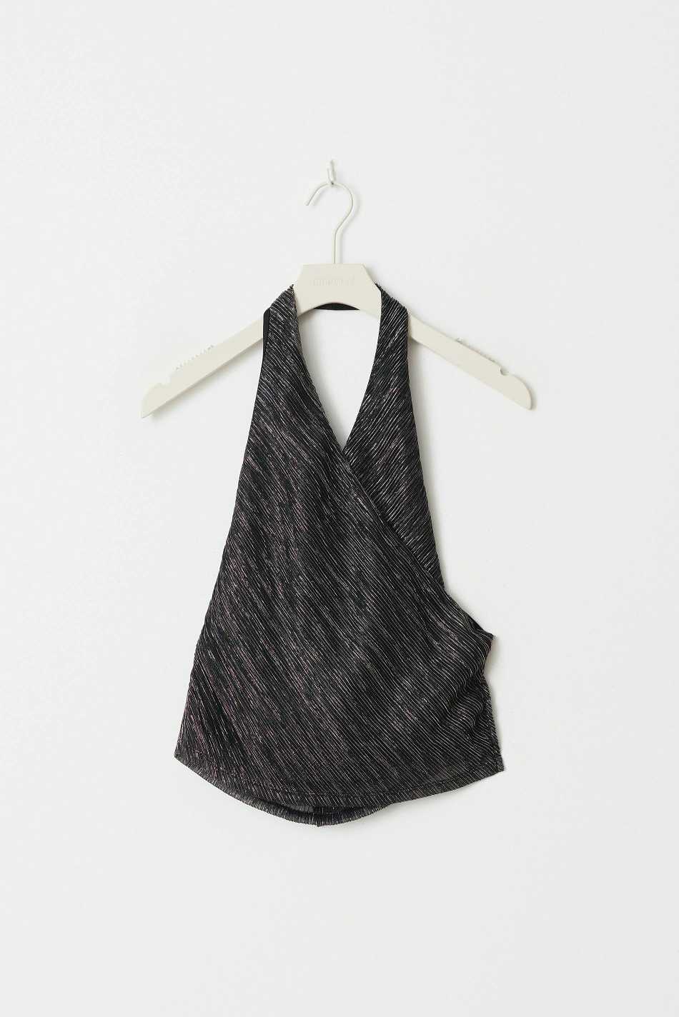 Sleeveless glitter top with halterneck design. The top is black and has open back. It has regular fit and v-neck.