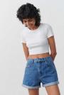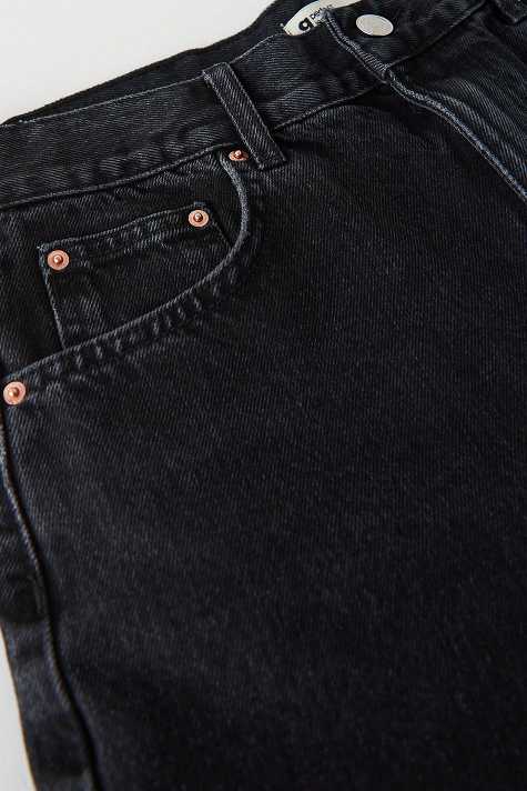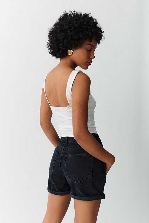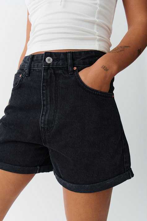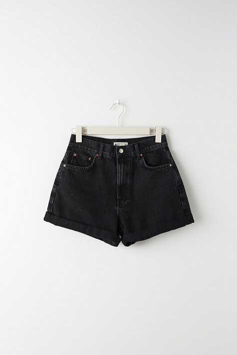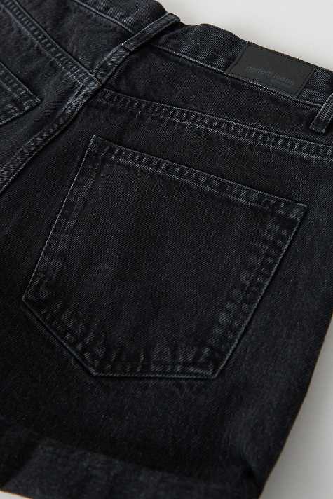 Short denim shorts with high waist. The shorts are black-grey and have oversize fit in non-stretch denim. They have wide legs, fold up hem, zip fly and pockets at the front and back.
