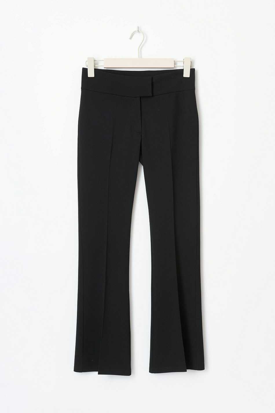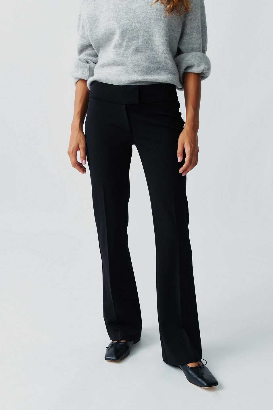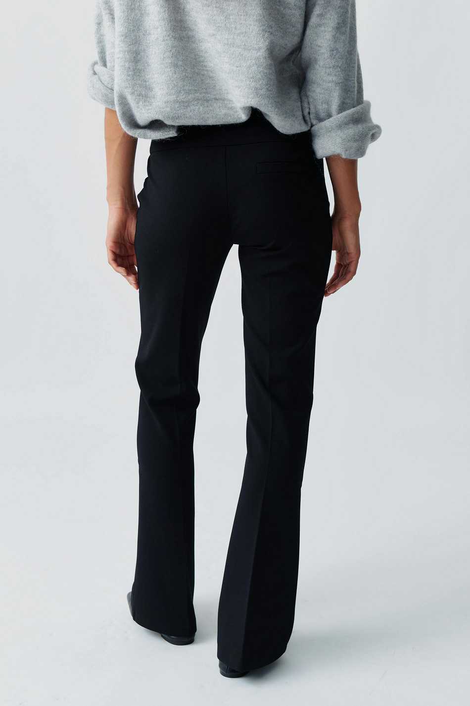 Flared suit trousers in jersey with low waist. The trousers are black and have creases. They have regular fit, zip fly and hook-and-eye closure.