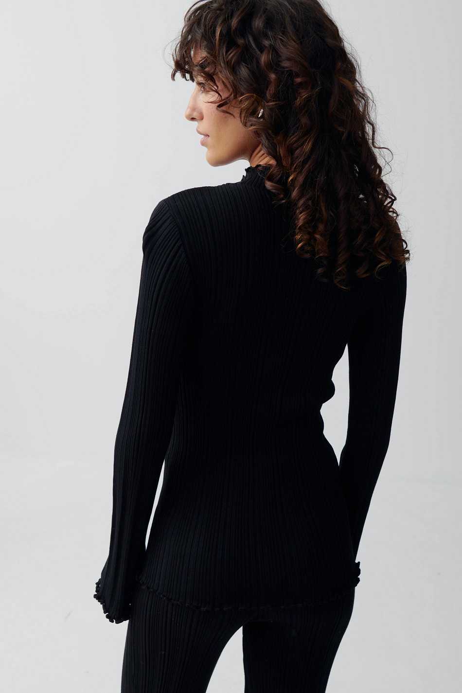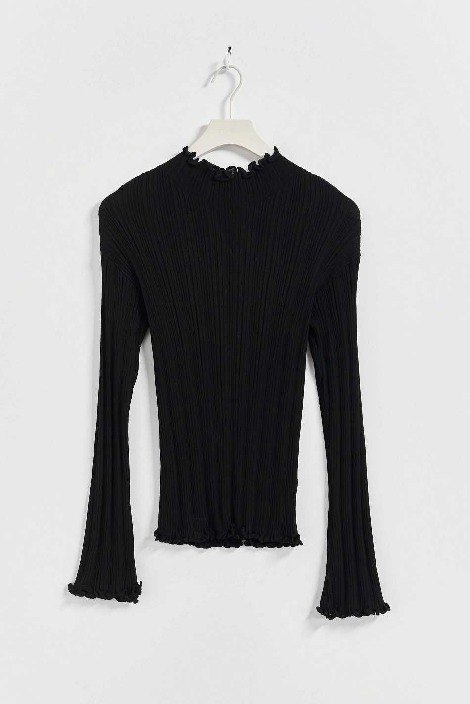Pleated turtleneck top with figure-hugging fit. The top is black and has high neck. It has long sleeve and overlocked hem.