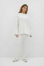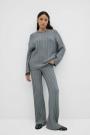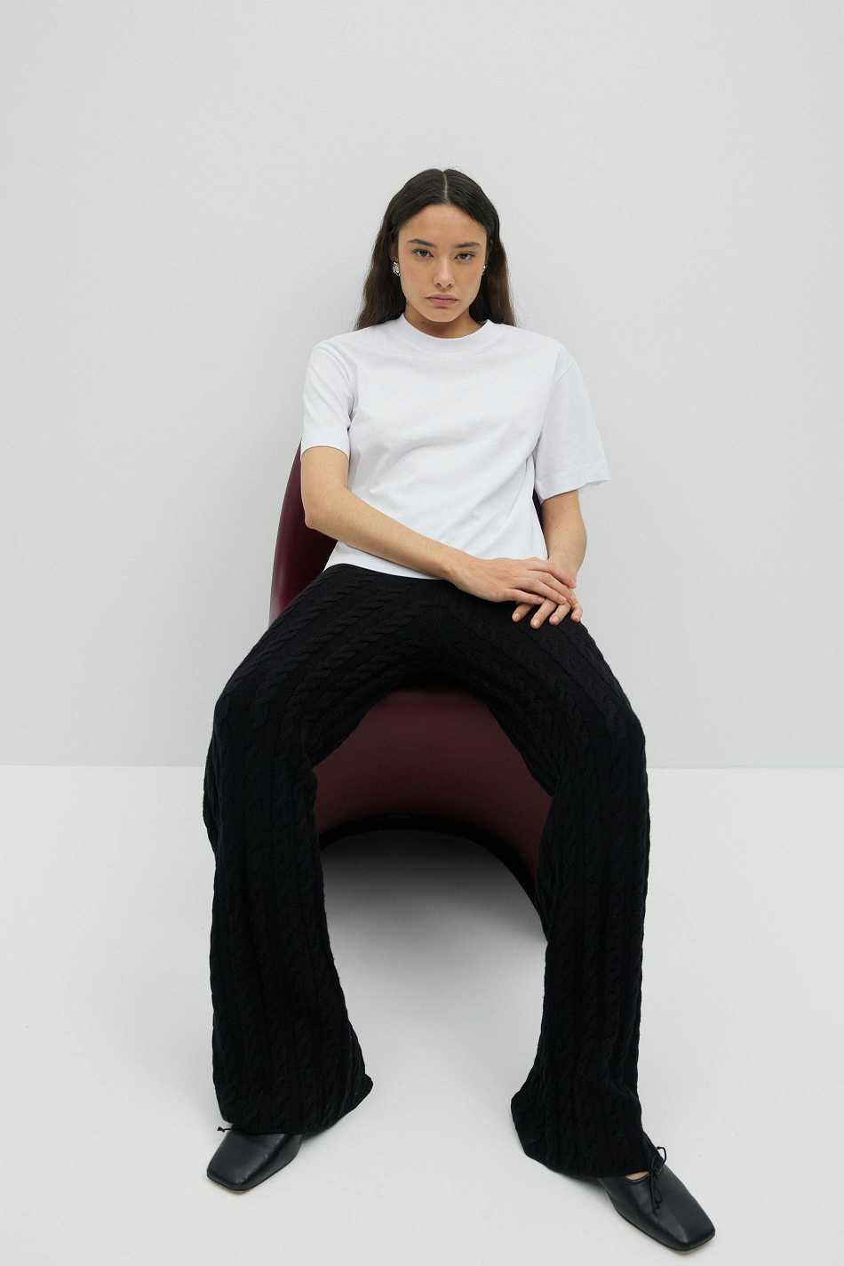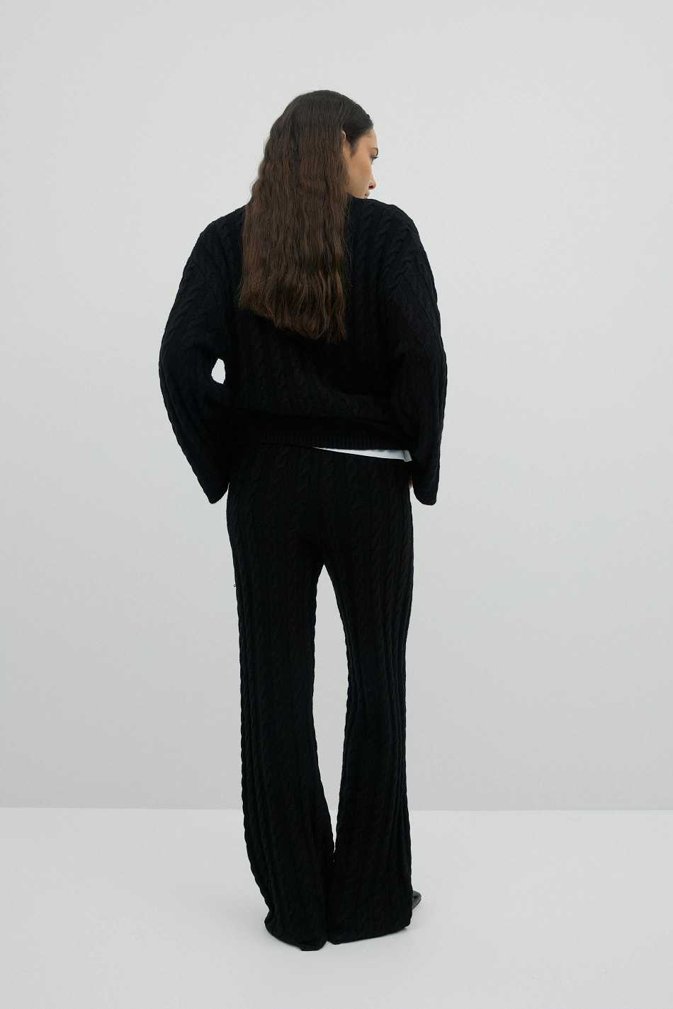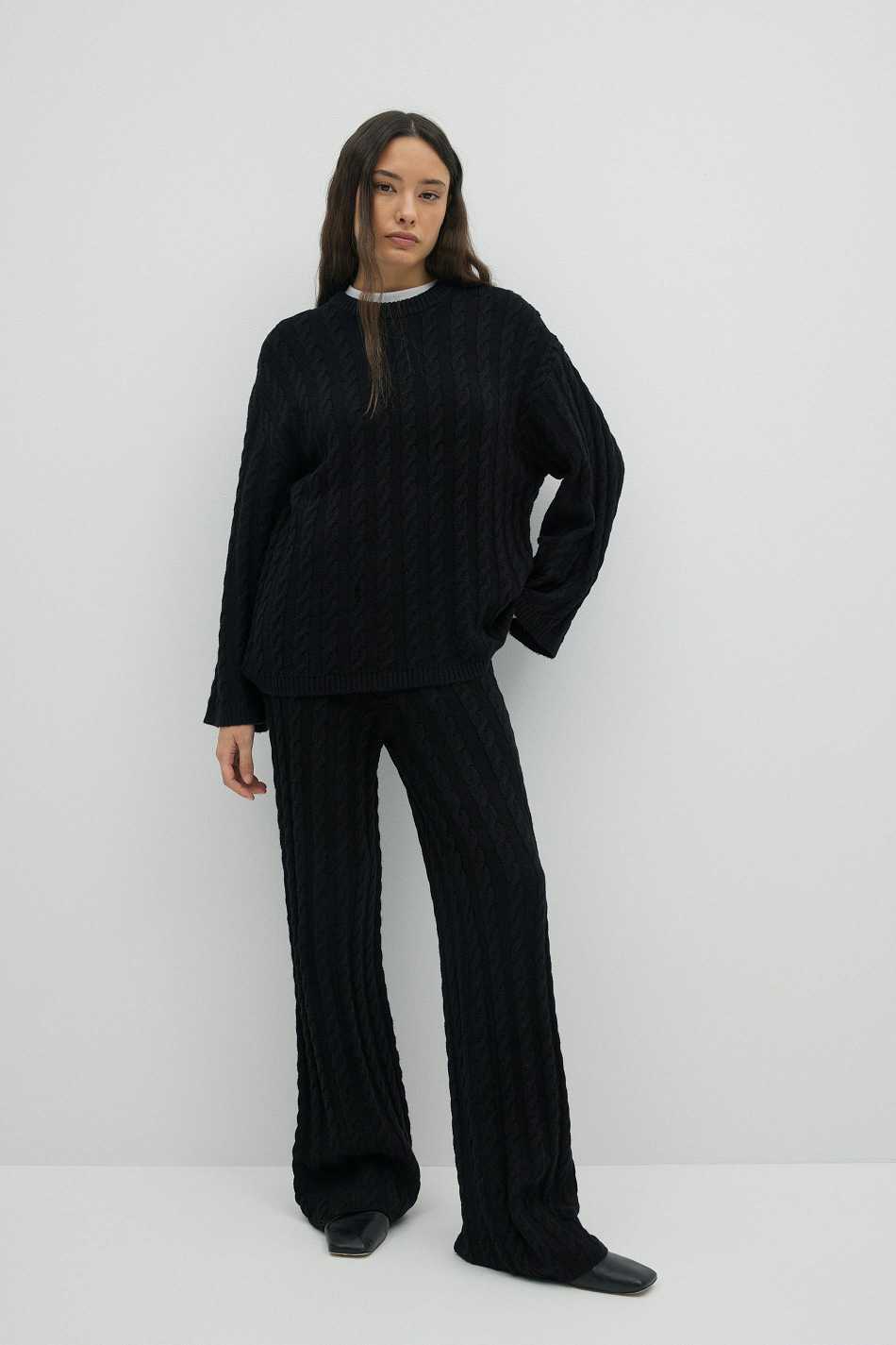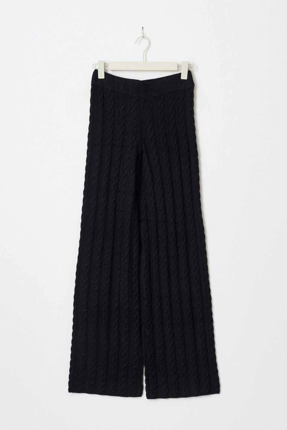 Cable knit trousers with straight legs. The trousers are black and have elastic at the waist.