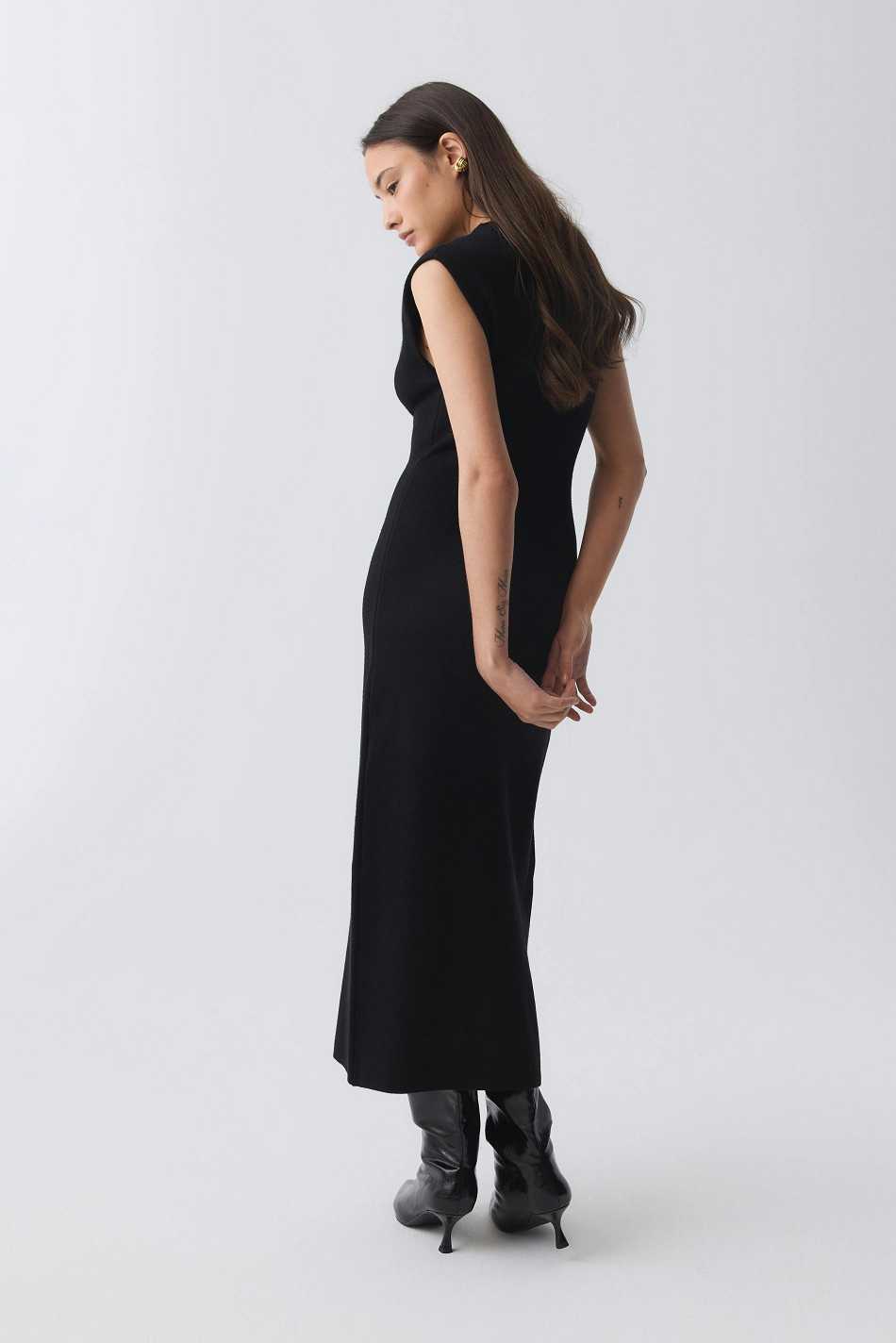 Long knit dress with figure-hugging fit. The dress is black and has high neckline. It has sleeveless design and midi length.