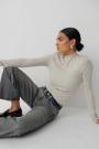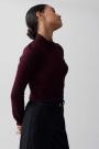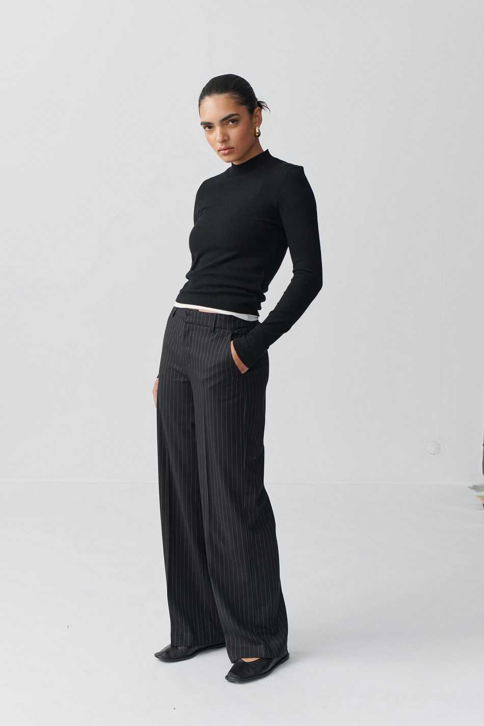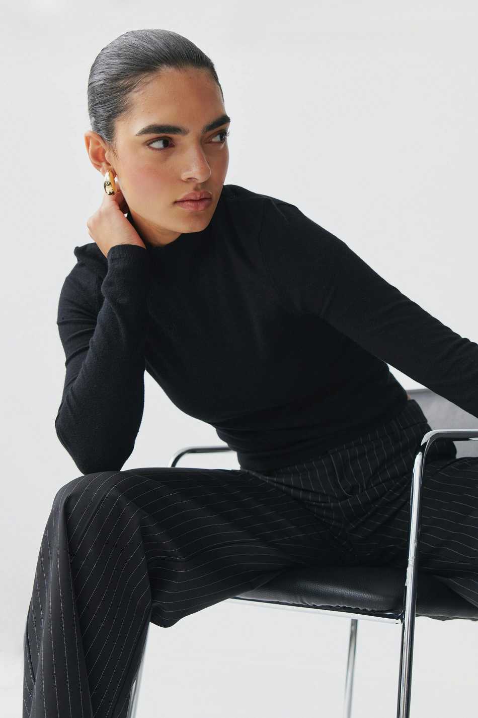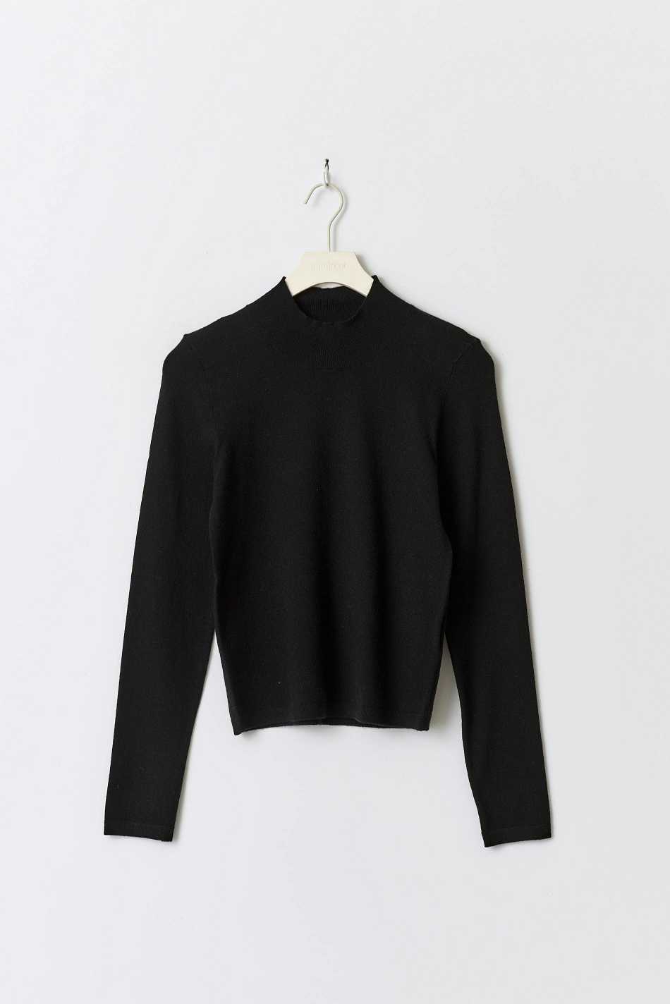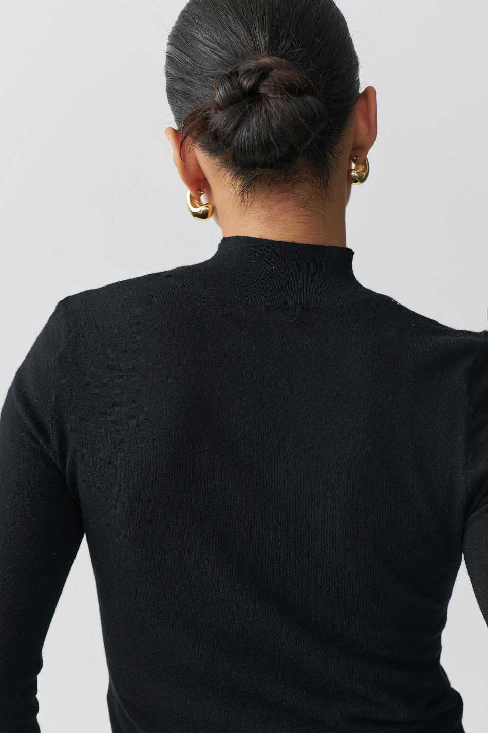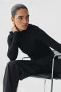 Knitted top with turtleneck. The top is black and has figure-hugging fit. It has long sleeve and rib knit at the bottom.