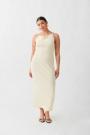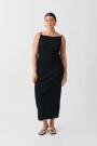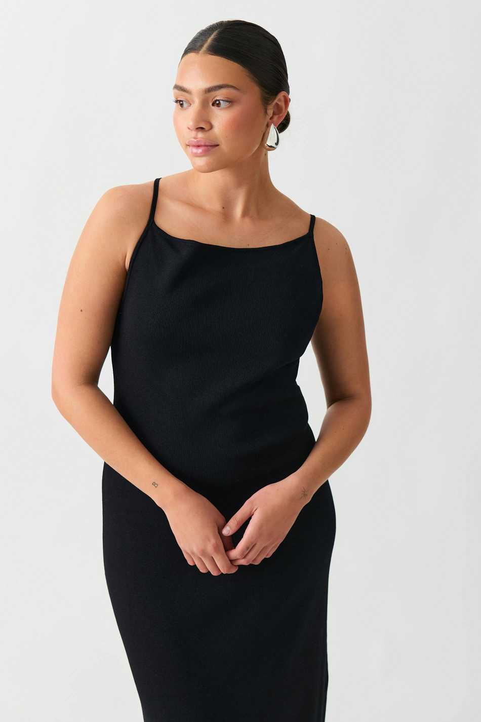 Knitted midi dress with narrow shoulder straps crossing at the back. The dress is black and sleeveless and has figure-hugging fit.