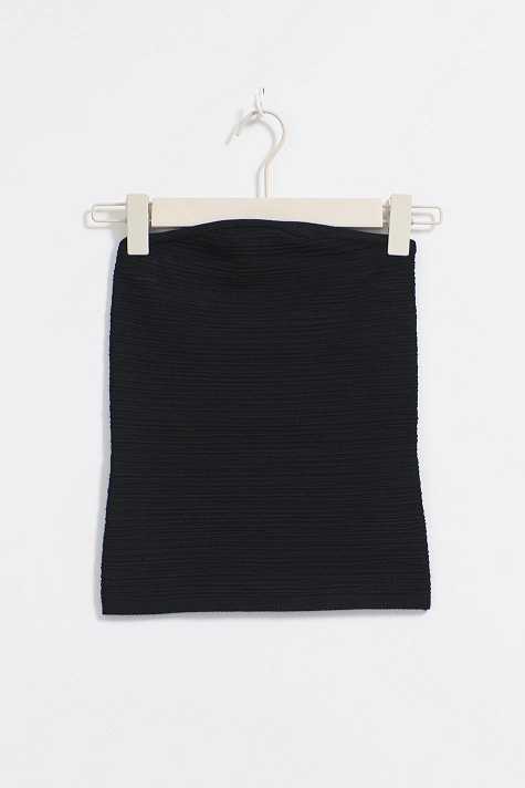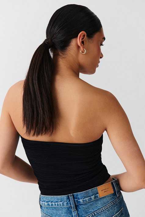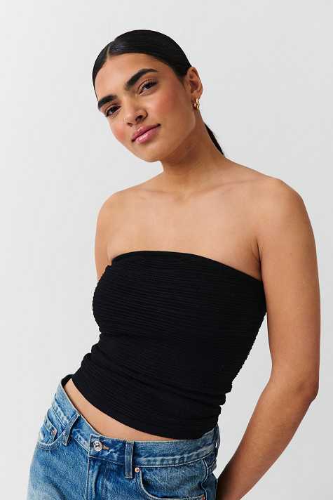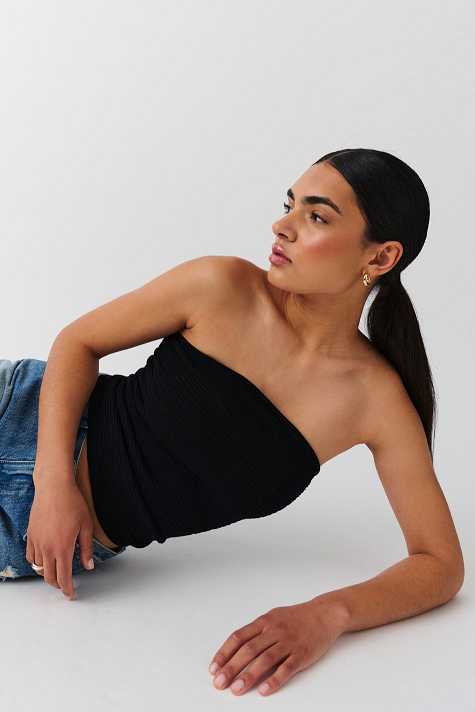 Knitted tube top with figure-hugging fit. The top is black and has structured material. It has regular length.