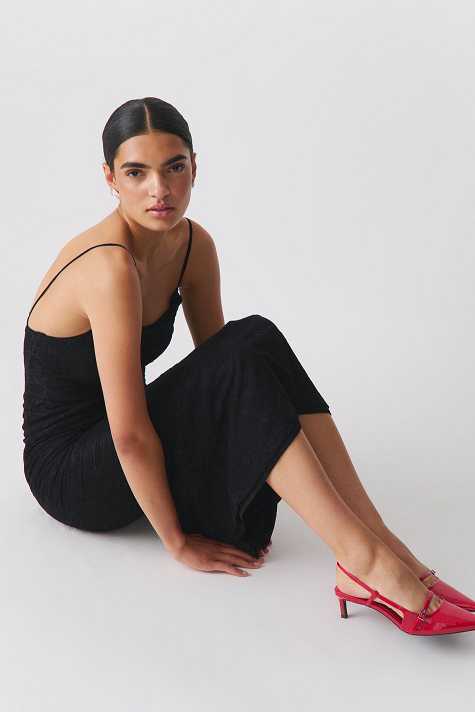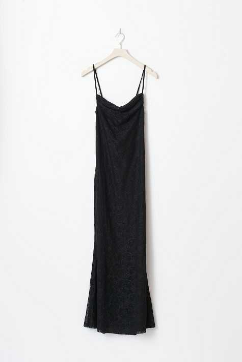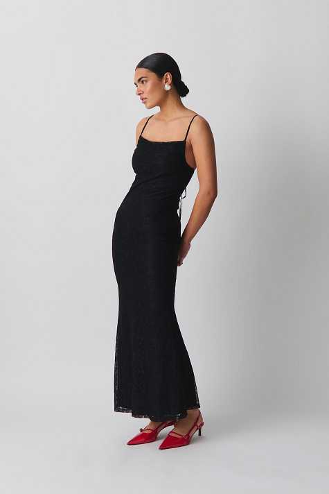 Long dress with open back. The dress is black, sleeveless and lined. It has cowl neck, narrow shoulder straps and self-tie at the back.