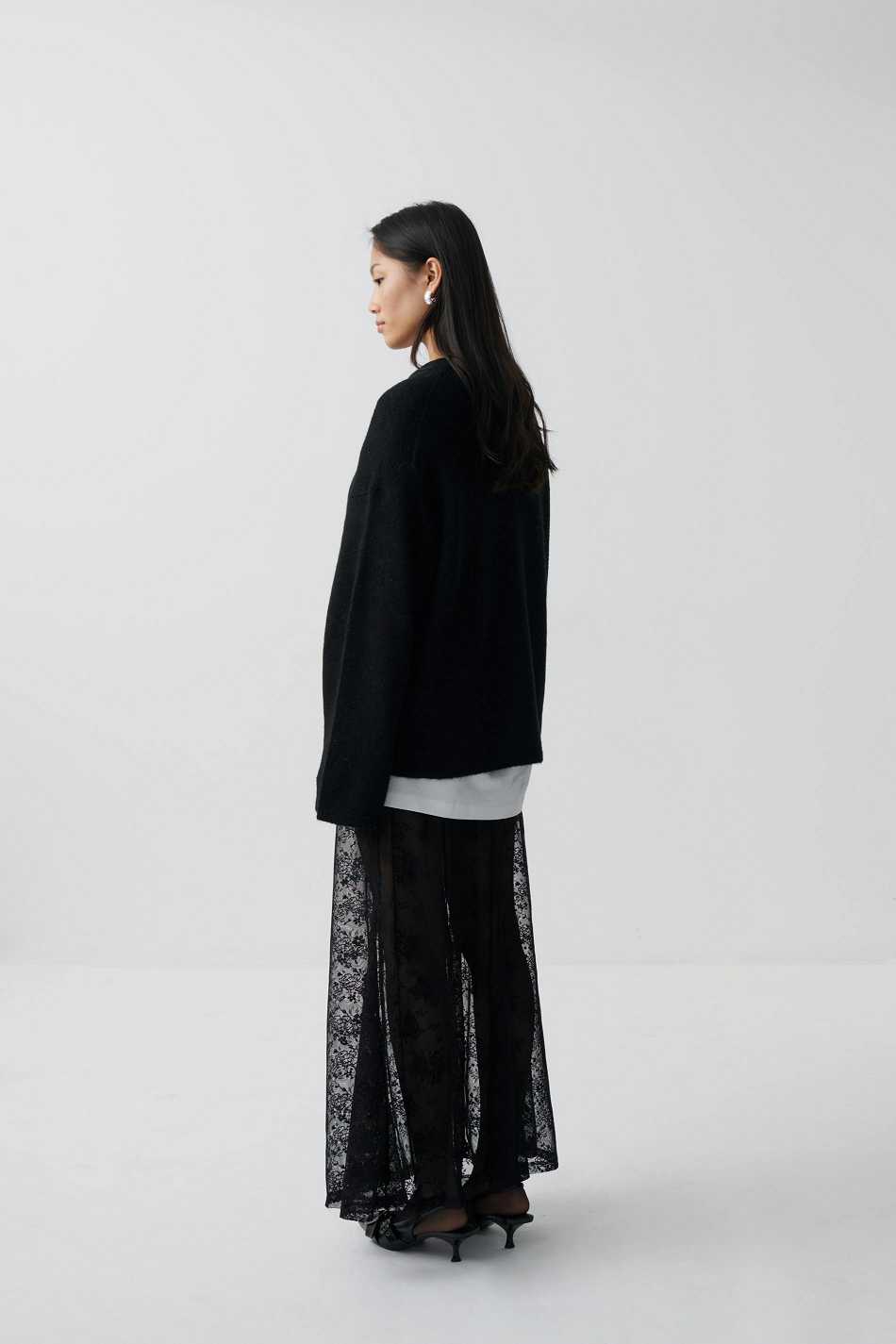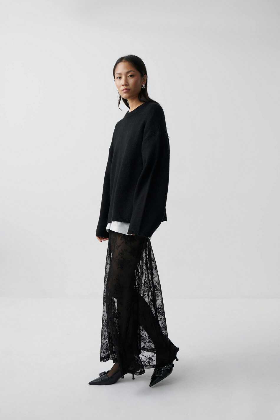 Long lace skirt with regular fit. The skirt is black and has low waist with elastic.