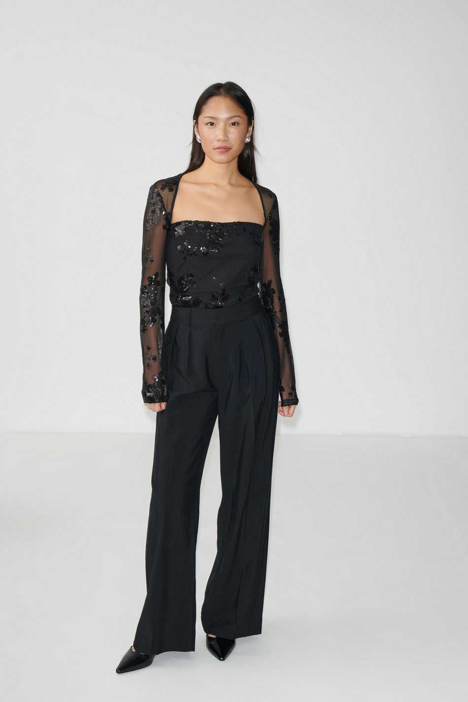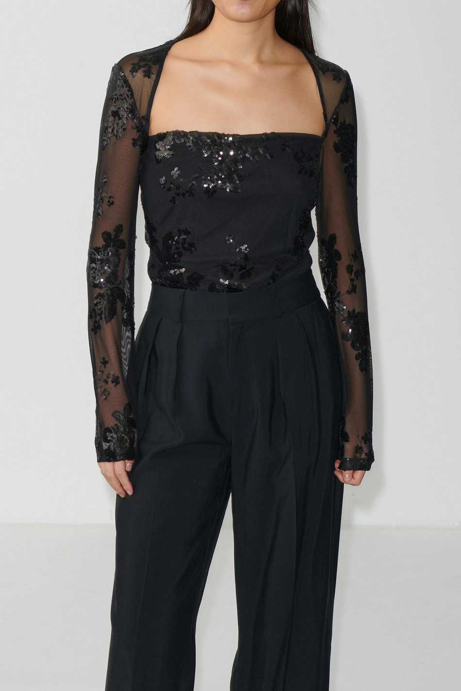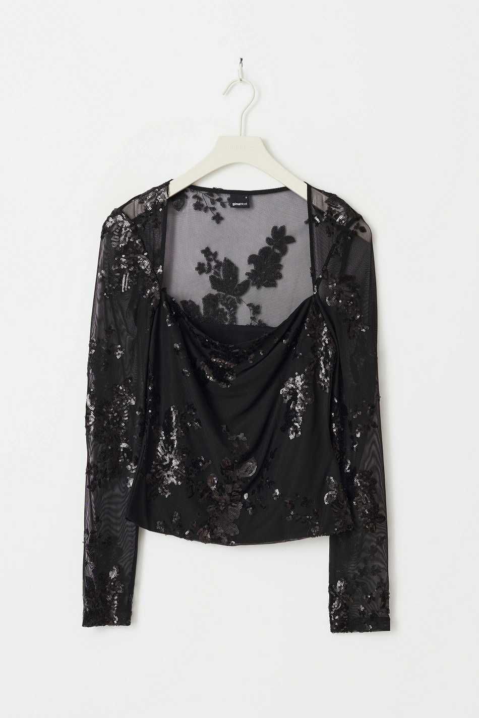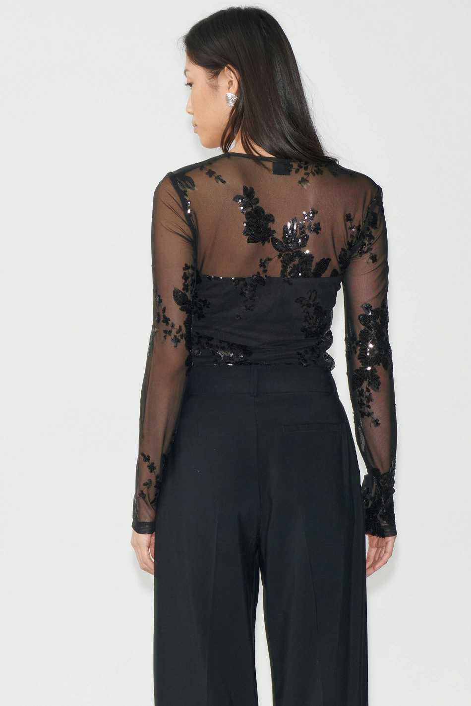 Long sleeve top in mesh with sequins. The top is black and has floral pattern. It has square neckline and regular fit.