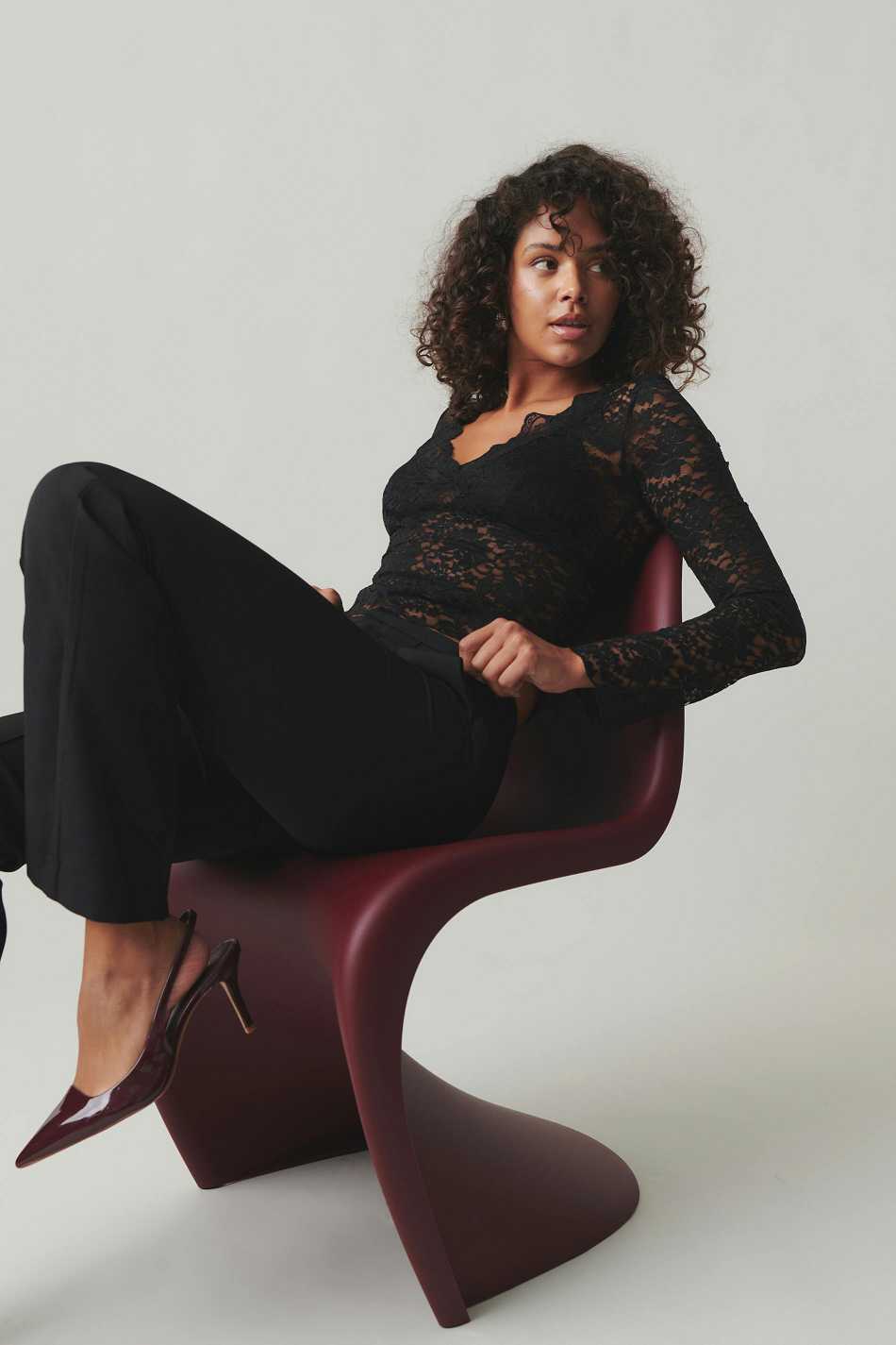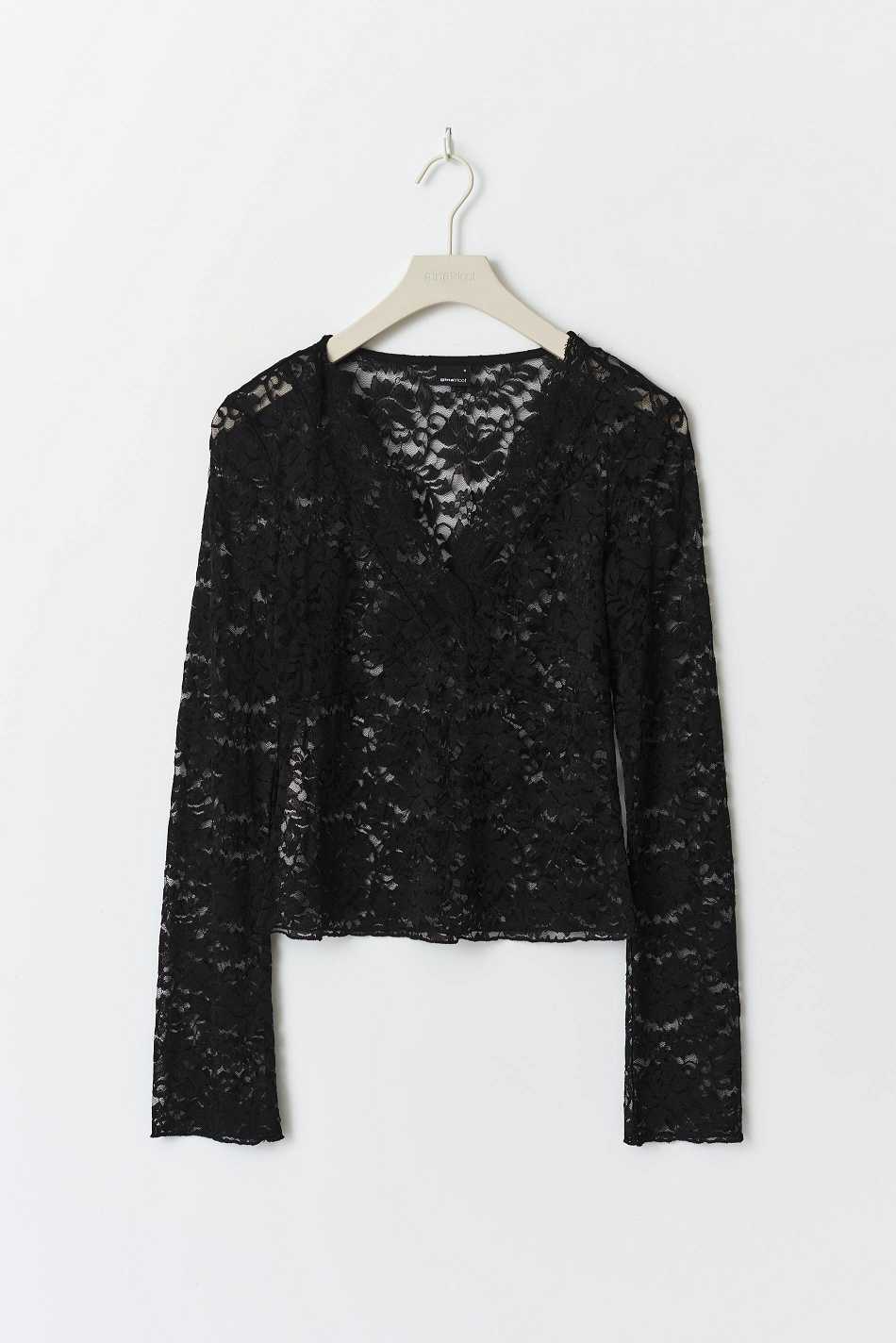 Long-sleeved lace top with v-neck. The top is black and has regular fit. Unlined.